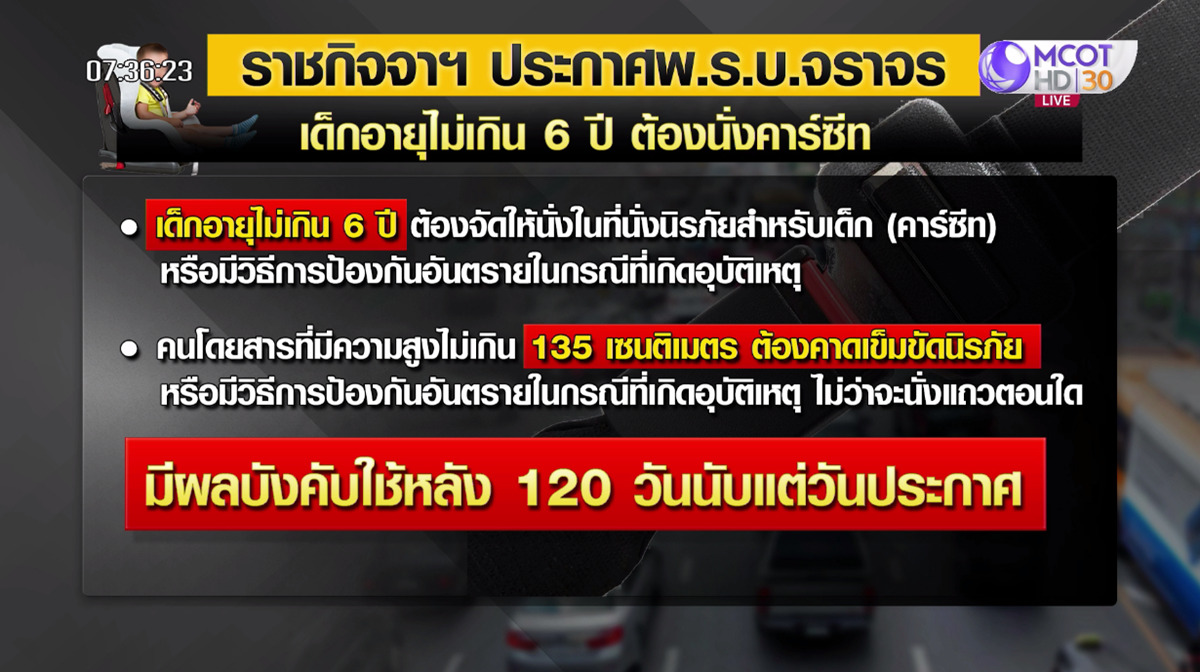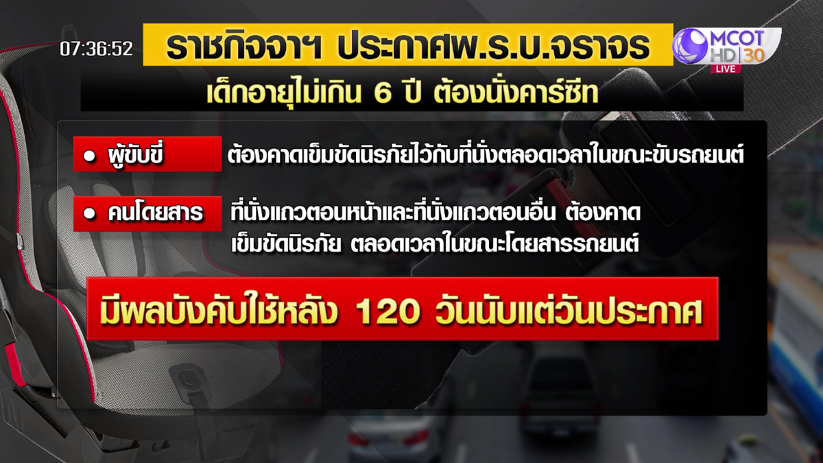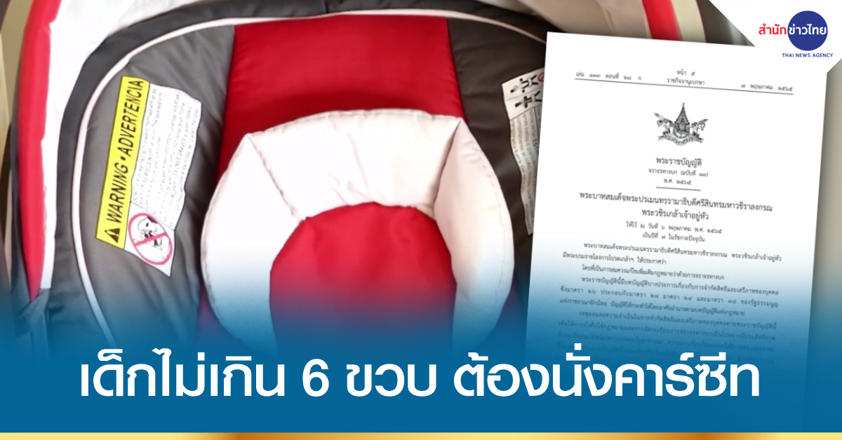 กรุงเทพฯ 9 พ.ค. – ราชกิจจานุเบกษา เผยแพร่ พ.ร.บ.จราจรทางบก เด็กอายุไม่เกิน 6 ปี ต้องนั่งคาร์ซีท ขณะที่เด็กสูงไม่เกิน 135 ซม. ต้องคาดเข็มขัดนิรภัย ห้ามอุ้มนั่งเด็ดขาด ฝ่าฝืนมีโทษปรับ 2,000 บาท
