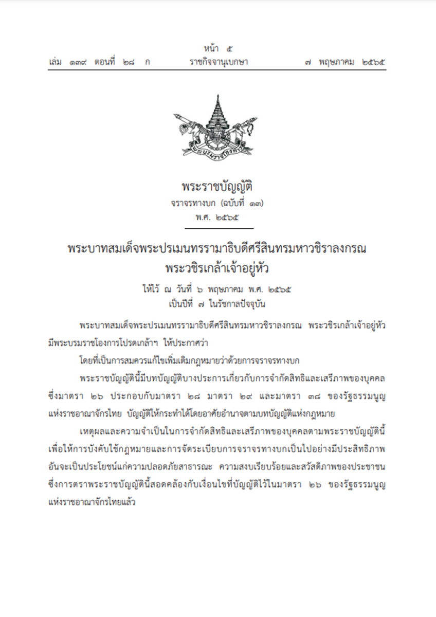 พระราชบัญญัตินี้เรียกว่า “พระราชบัญญัติจราจรทางบก (ฉบับที่ 13) พ.ศ. 2565” มาตรา 2 พระราชบัญญัตินี้ให้ใช้บังคับเมื่อพ้นกำหนดหนึ่งร้อยยี่สิบวัน นับแต่วันประกาศในราชกิจจานุเบกษาเป็นต้นไป”