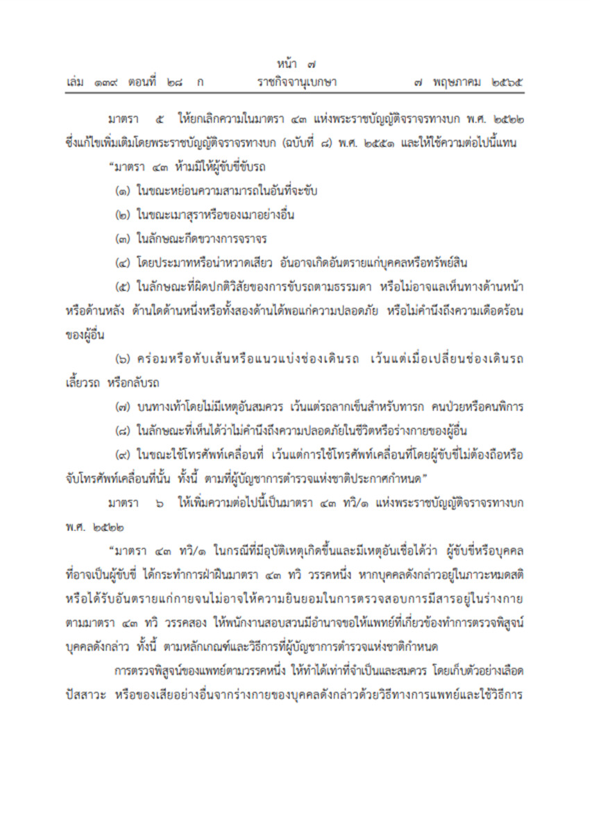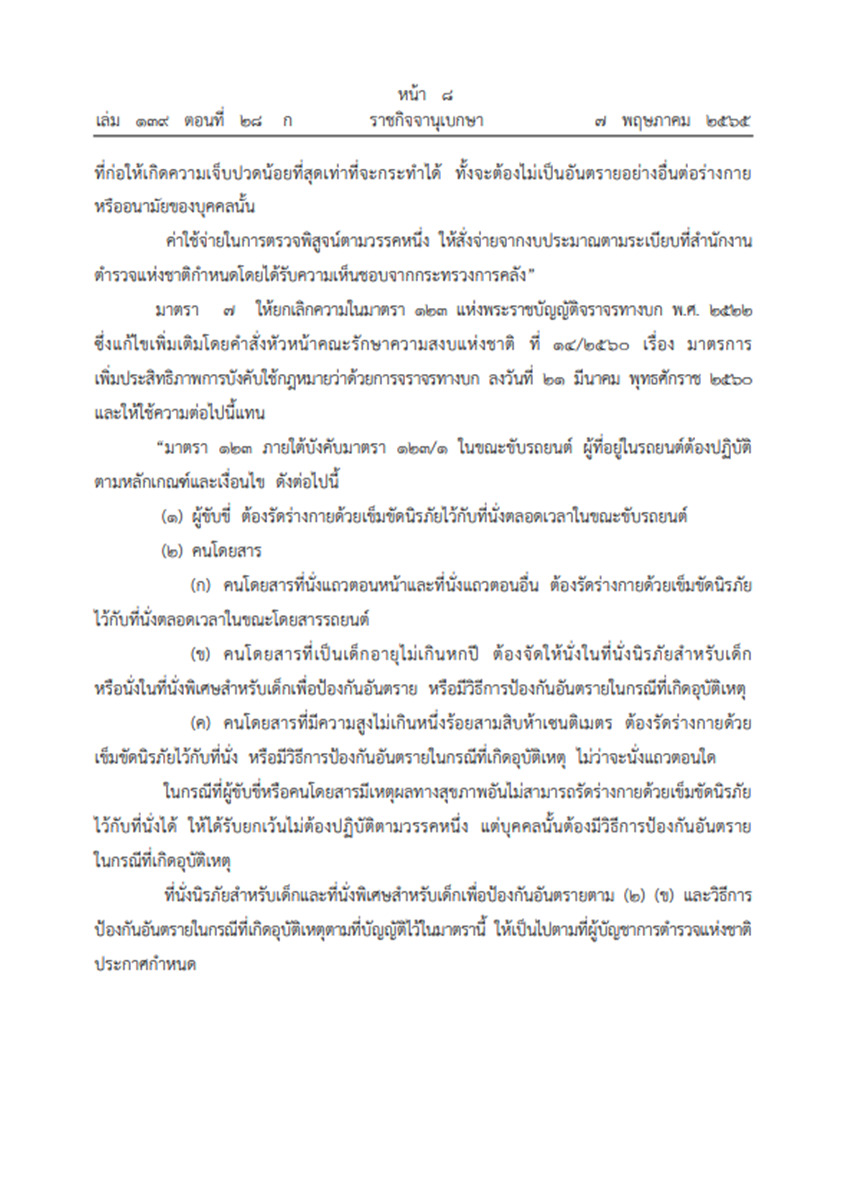 มาตรา 7 ให้ยกเลิกความในมาตรา 123 แห่งพระราชบัญญัติจราจรทางบก พ.ศ. 2522 ซึ่งแก้ไขเพิ่มเติมโดยคำสั่งหัวหน้าคณะรักษาความสงบแห่งชาติ ที่ 14/2560 เรื่อง มาตรการเพิ่มประสิทธิภาพการบังคับใช้กฎหมายว่าด้วยการจราจรทางบก ลงวันที่ 21 มีนาคม พุทธศักราช 2560 และให้ใช้ความต่อไปนี้แทน “มาตรา 123 ภายใต้บังคับมาตรา 123/1 ในขณะขับรถยนต์ ผู้ที่อยู่ในรถยนต์ต้องปฏิบัติตามหลักเกณฑ์และเงื่อนไข ดังต่อไปนี้