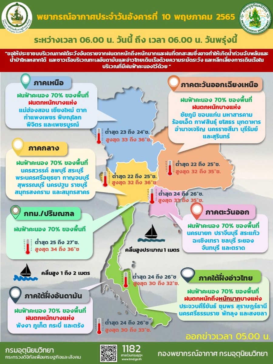กรมอุตุฯ 10 พ.ค. – กรมอุตุฯ ออกประกาศฉบับที่ 9 พายุ “อัสนี” จ่อเคลื่อนขึ้นฝั่งอินเดียตอนกลาง ช่วงวันที่ 10-11 พ.ค.นี้ ส่งผลให้ไทยยังคงมีฝนตกต่อเนื่องและตกหนักบางแห่ง โดยมีฝนตกหนักมากในภาคใต้ ระวังน้ำท่วมฉับพลันและน้ำป่าไหลหลาก