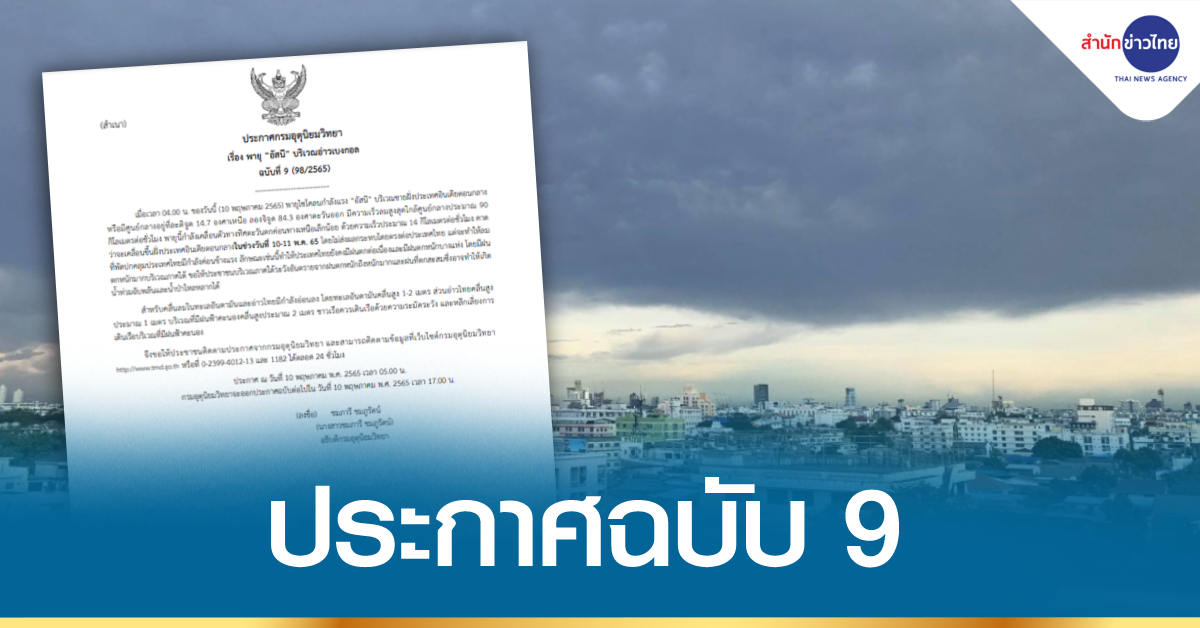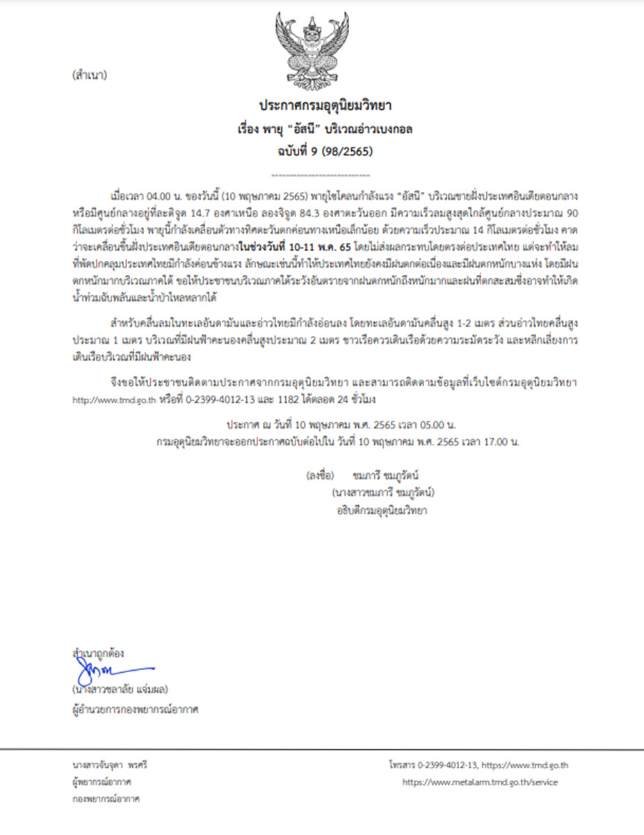 กรมอุตุนิยมวิทยา ออกประกาศ เรื่อง พายุ “อัสนี” บริเวณอ่าวเบงกอล ฉบับที่ 9 ลงวันที่ 10 พฤษภาคม 2565 ระบุว่า เมื่อเวลา 04.00 น. วันนี้ (10 พ.ค.65) พายุไซโคลนกำลังแรง “อัสนี” บริเวณชายฝั่งประเทศอินเดียตอนกลาง หรือมีศูนย์กลางอยู่ที่ละติจูด 14.7 องศาเหนือ ลองจิจูด 84.3 องศาตะวันออก มีความเร็วลมสูงสุดใกล้ศูนย์กลางประมาณ 90 กิโลเมตร/ชั่วโมง พายุนี้กำลังเคลื่อนตัวทางทิศตะวันตกค่อนทางเหนือเล็กน้อย ด้วยความเร็วประมาณ 14 กิโลเมตร/ชั่วโมง คาดว่าจะเคลื่อนขึ้นฝั่งประเทศอินเดียตอนกลาง ในช่วงวันที่ 10-11 พ.ค.65 โดยไม่ส่งผลกระทบโดยตรงต่อประเทศไทย แต่จะทำให้ลมที่พัดปกคลุมประเทศไทยมีกำลังค่อนข้างแรง ลักษณะเช่นนี้ทำให้ประเทศไทยยังคงมีฝนตกต่อเนื่องและมีฝนตกหนักบางแห่ง โดยมีฝนตกหนักมากบริเวณภาคใต้ ขอให้ประชาชนบริเวณภาคใต้ระวังอันตรายจากฝนตกหนักถึงหนักมากและฝนที่ตกสะสม ซึ่งอาจทำให้เกิดน้ำท่วมฉับพลันและน้ำป่าไหลหลากได้