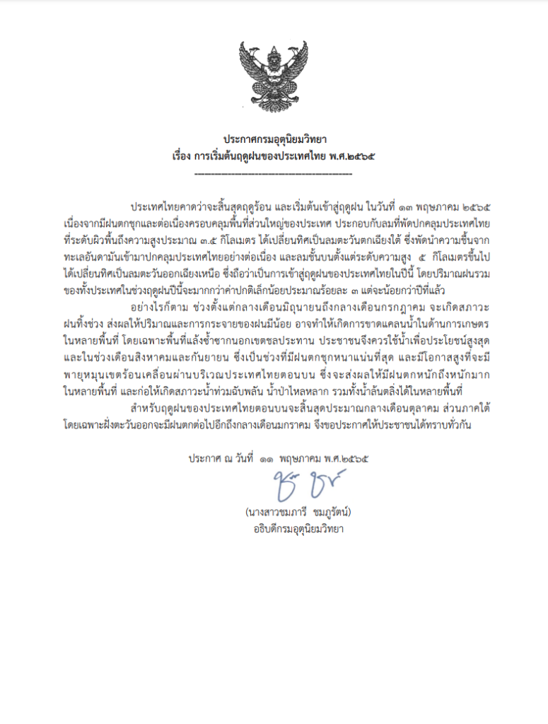 ประกาศกรมอุตุนิยมวิทยา เรื่อง การเริ่มต้นฤดูฝนของประเทศไทย พ.ศ.2565 ระบุประเทศไทยคาดว่าจะสิ้นสุดฤดูร้อน และเริ่มต้นเข้าสู่ฤดูฝน ในวันที่ 13 พฤษภาคม 2565 เนื่องจากมีฝนตกชุกและต่อเนื่องครอบคลุมพื้นที่ส่วนใหญ่ของประเทศ ประกอบกับลมที่พัดปกคลุมประเทศไทยที่ระดับผิวพื้นถึงความสูงประมาณ 3.5 กิโลเมตร ได้เปลี่ยนทิศเป็นลมตะวันตกเฉียงใต้ ซึ่งพัดนำความชื้นจากทะเลอันดามันเข้ามาปกคลุมประเทศไทยอย่างต่อเนื่อง และลมชั้นบนตั้งแต่ระดับความสูง 5 กิโลเมตรขึ้นไปได้เปลี่ยนทิศเป็นลมตะวันออกเฉียงเหนือ ซึ่งถือว่าเป็นการเข้าสู่ฤดูฝนของประเทศไทยในปีนี้ โดยปริมาณฝนรวมของทั้งประเทศในช่วงฤดูฝนปีนี้จะมากกว่าค่าปกติเล็กน้อยประมาณร้อยละ 3 แต่จะน้อยกว่าปีที่แล้ว