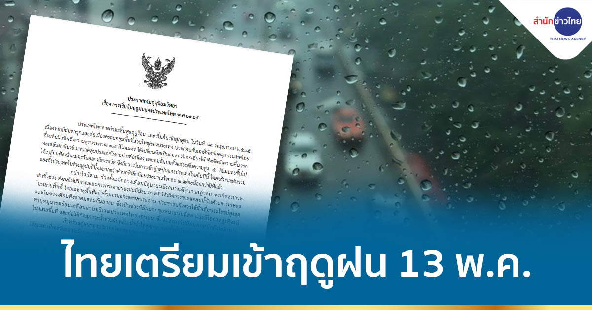 กทม. 11 พ.ค.- กรมอุตุฯ ออกประกาศประเทศไทยเตรียมเข้าสู่ “ฤดูฝน” อย่างเป็นทางการ เริ่มวันที่ 13 พ.ค.นี้ ขณะที่ตั้งแต่กลาง มิ.ย.- ก.ค. จะเกิดสภาวะฝนทิ้งช่วง