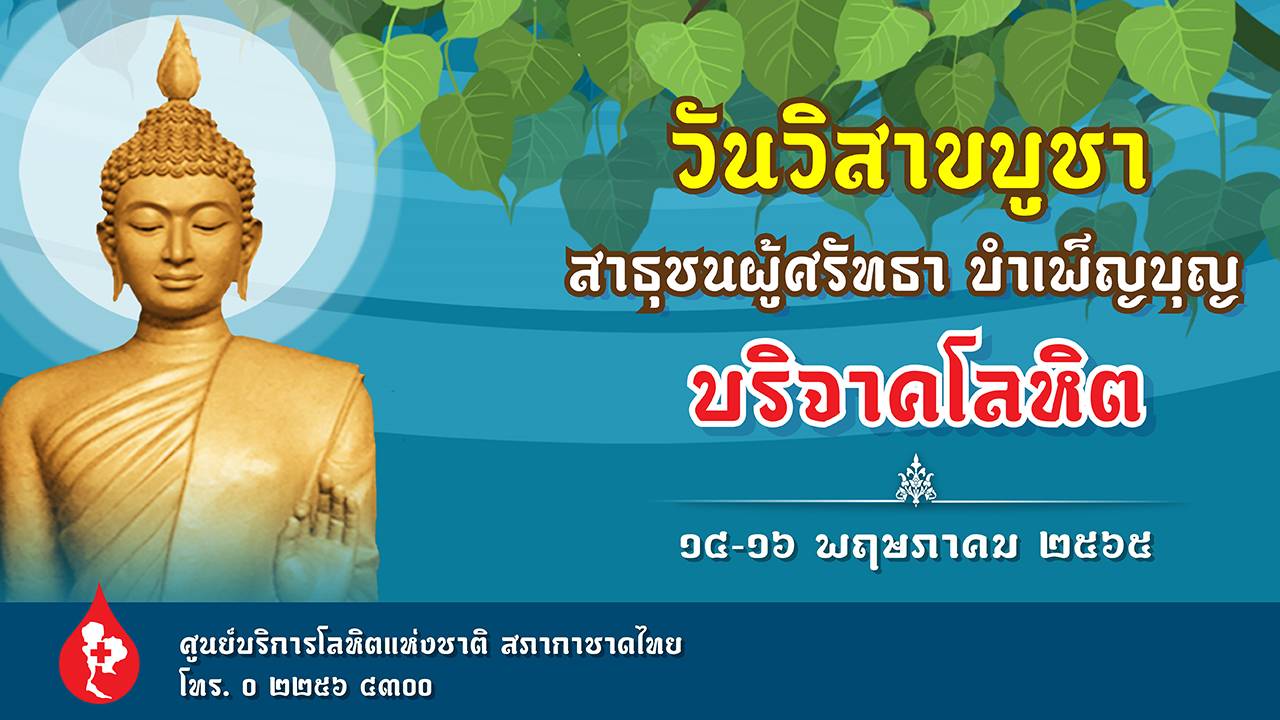 ศูนย์บริการโลหิตแห่งชาติ สภากาชาดไทย ชวนพุทธศาสนิกชนร่วมทำบุญวันพระใหญ่ ให้ชีวิตแก่ผู้ป่วยถวายเป็นพุทธบูชา บริจาคโลหิตในโครงการ “สาธุชนผู้ศรัทธา บำเพ็ญบุญ บริจาคโลหิต เนื่องในวันวิสาขบูชา” ระหว่างวันที่ 14-16 พฤษภาคม 2565 ณ ศูนย์บริการโลหิตแห่งชาติ หน่วยรับบริจาคโลหิตประจำที่ ภาคบริการโลหิตแห่งชาติ และโรงพยาบาลสาขาบริการโลหิตทั่วประเทศ