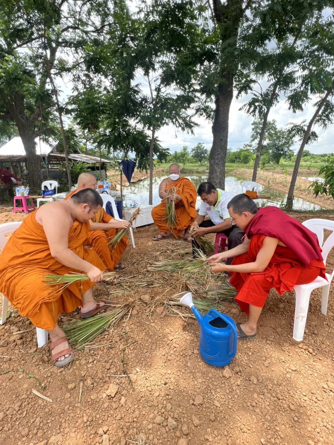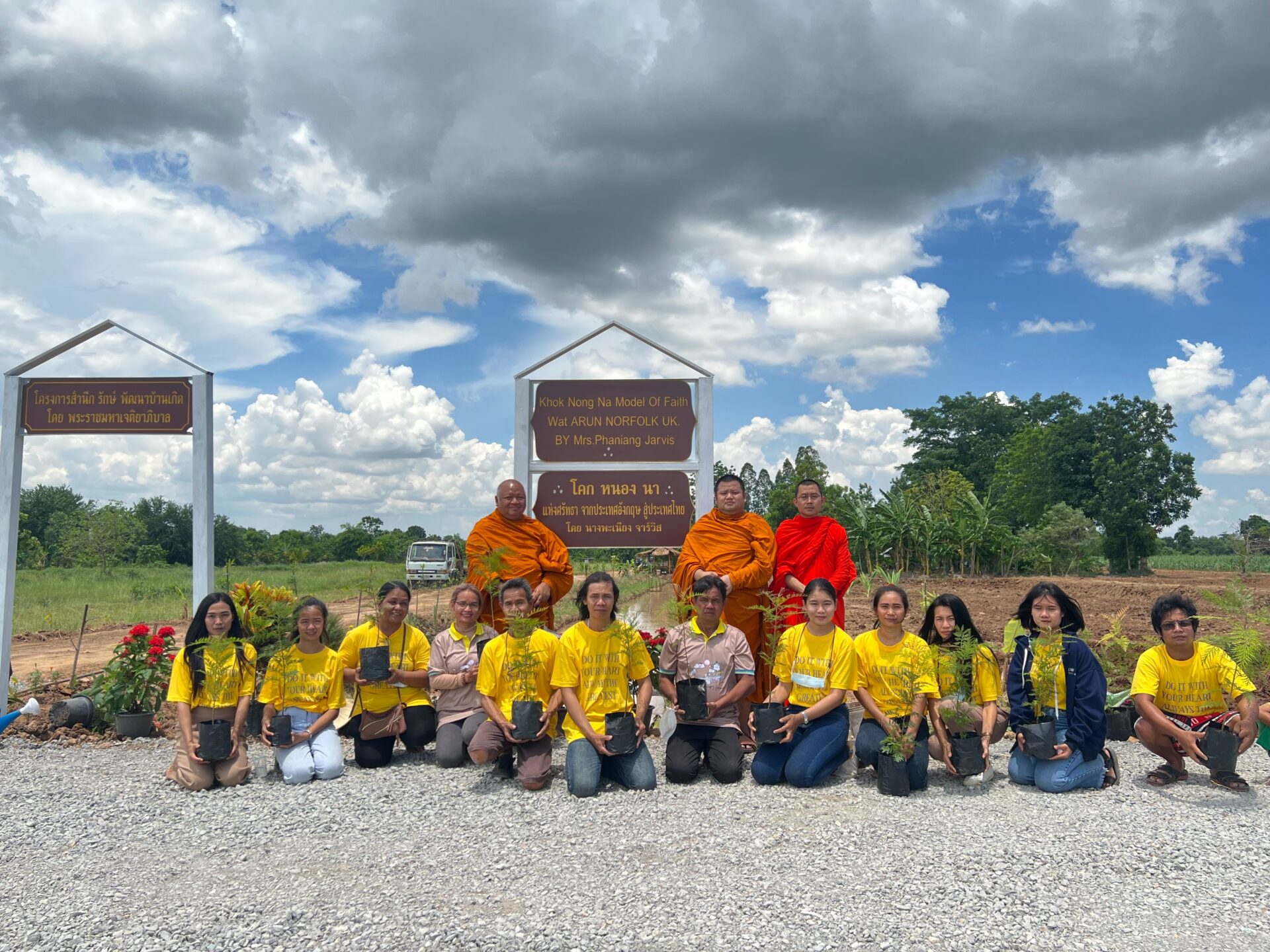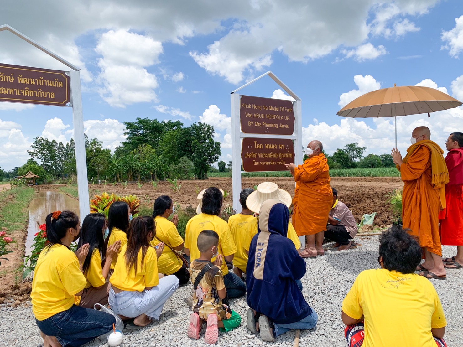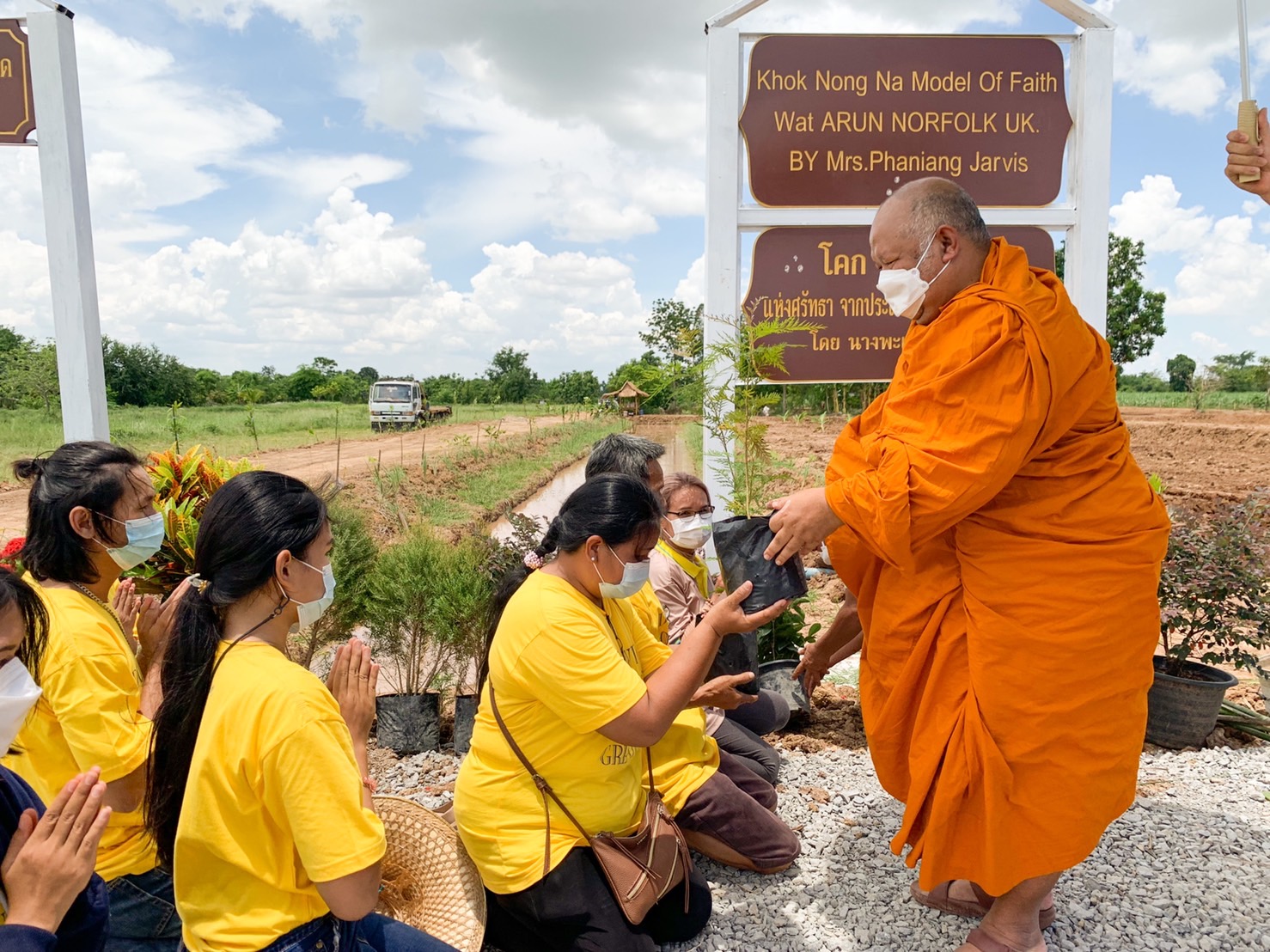 พระราชมหาเจติยาภิบาล ประธานสมาคมวัดอรุณสหราชอาณาจักร พร้อมด้วยคณะพระธรรมทูต เดินทางไปประกอบพิธีเจิมป้ายโครงการโคก หนอง นา และปลูกต้นไม้เป็นปฐมฤกษ์ ซึ่งถือฤกษ์มงคลหลังจากงานพระราชพิธีพืชมงคลจรดพระนังคัลแรกนาขวัญ ซึ่งถือเป็นวันเริ่มต้นเข้าสู่ฤดูหว่านไถของชาวไร่ ชาวนาประจำปี ในโอกาสที่ นาง พะเนียง จาวิส ซึ่งเป็นมหาอุบาสิกา ชาววัดอรุณสหราชอาณาจักร ได้นำแนวคิดนี้กลับมาทำที่บ้านเกิด โดยคำแนะนำของพระราชมหาเจติยาภิบาล และคณะพระธรรมทูตคอยช่วยเหลือสนับสนุนให้ดำเนินโครงการนี้ เพื่อต่อยอดโครงการ และเป็นฐานรองรับการเป็นอยู่ในอนาคตให้แก่ตนเอง และครอบครัว ด้วยความรัก ความผูกพันธุ์ในบ้านเกิดของตน