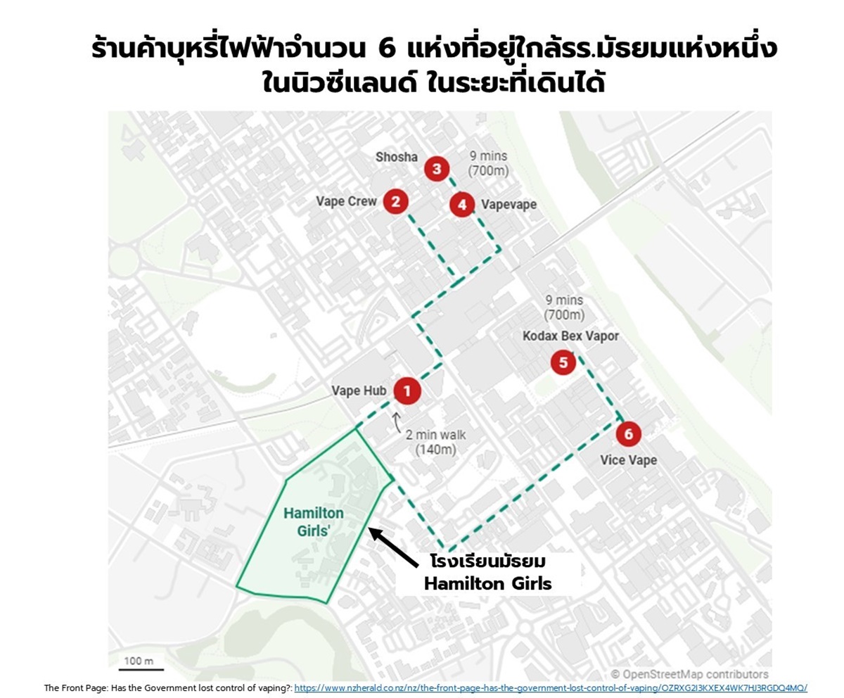 ด้าน น.ส.เอมม่า รัสเซล ผู้สื่อข่าวสายสุขภาพของ NZ Herald นิวซีแลนด์ ได้เปิดเผยสถานการณ์ระบาดของบุหรี่ไฟฟ้าในกลุ่มเยาวชนนิวซีแลนด์ ภายหลังรัฐบาลยกเลิกการแบนบุหรี่ไฟฟ้าและส่งเสริมการใช้บุหรี่ไฟฟ้าเพื่อเลิกบุหรี่ ว่า การเสพติดบุหรี่ไฟฟ้าในเยาวชนเป็นเรื่องที่น่ากังวลตั้งแต่เริ่มแรก และรัฐบาลได้ให้คำมั่นสัญญาว่าเยาวชนจะได้รับการคุ้มครอง แต่เห็นได้ชัดว่ายังไม่เกิดขึ้น ซึ่งจำนวนร้านค้าบุหรี่ไฟฟ้าในนิวซีแลนด์มีจำนวนเพิ่มขึ้นอย่างน่าเป็นห่วง ร้านบุหรี่ไฟฟ้าบางยี่ห้อมีจำนวนร้านค้าปลีกย่อยถึง 100 สาขา เกือบจะเท่ากับร้านฟาสต์ฟู้ดอย่างแมคโดนัลด์ที่มี 167 สาขา โดยเฉพาะที่อยู่ใกล้สถานศึกษา พบว่าโรงเรียนบางแห่งมีร้านค้าบุหรี่ไฟฟ้าอยู่รอบๆ โรงเรียนถึง 6 ร้าน และร้านเหล่านี้ยังตกแต่งให้ดึงดูดเยาวชนอีกด้วย. – สำนักข่าวไทย