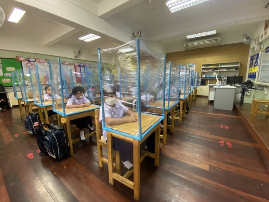 ส่วนในห้องเรียนพบว่ามีการจัดโต๊ะเว้นระยะห่างตามปกติ นร.เข้าเรียนได้พร้อมกันทุกคน แต่ละห้องมีประมาณ 30 คน แต่ละโต๊ะมีฉากใสกั้น ส่วนของเด็กชั้นป.1-ป.2 ครูประจำชั้น จะดูแลเป็นพิเศษ เพราะเป็นช่วงวัยที่อาจจะเล่นกันใกล้ชิด ส่วนอาหารกลางวันเด็กประถมที่ รร.มีอาหารจัดให้ ก็จะทานข้าวแยกกันที่โต๊ะของตนเองในห้องเรียน ส่วนนักเรียนระดับมัธยม จะเหลื่อมเวลากันออกมาซื้ออาหารที่โรงเรียน เพื่อจำกัดจำนวน