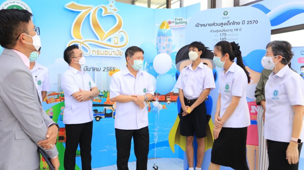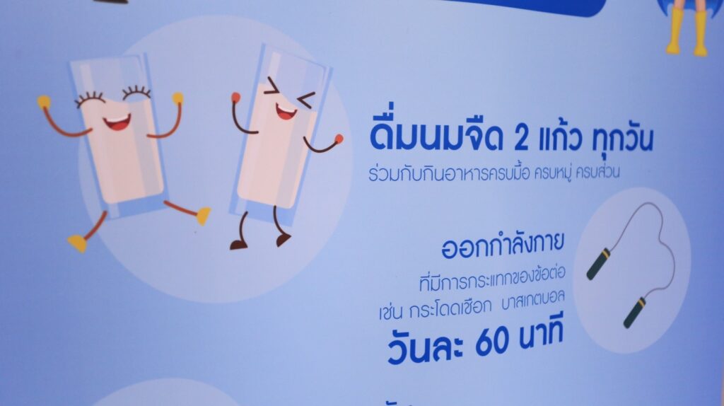 นพ.สุวรรณชัย กล่าวต่อไปว่า สำหรับปีนี้กรมอนามัยร่วมกับราชวิทยาลัยกุมารแพทย์แห่งประเทศไทย สถาบันโภชนาการ มหาวิทยาลัยมหิดล และเครือข่ายนมดีทุกวัยดื่มได้ทุกวัน ขับเคลื่อนงานส่งเสริมสุขภาพวัยเรียนวัยรุ่น โดยรณรงค์ให้เด็กไทยดื่มนมจืดแก้วที่ 2 ที่บ้าน วัยเรียนวัยรุ่นดื่มนมจืดให้ได้ 2 แก้วทุกวัน พร้อมขอความร่วมมือให้ผู้ปกครองช่วยเตรียมนมไว้ที่บ้านสำหรับเด็ก เนื่องจากผลการสำรวจของกรมอนามัยสอดคล้องกับสวนดุสิตโพล พบว่าเด็กและวัยรุ่นจะดื่มนมมากขึ้นถ้ามีนมติดบ้าน ร่วมกับกินอาหารประเภทอื่น ๆ ให้หลากหลาย ครบ 5 หมู่ ทั้ง 3 มื้อ ในปริมาณสัดส่วนที่เหมาะสม โดยเฉพาะวัยเรียน วัยรุ่น ควรส่งเสริมให้ออกกำลังกายที่มีการกระแทกของข้อต่อ เช่น การกระโดดวันละ 60 นาที รับแสงแดดทุกวันเพื่อให้ได้รับวิตามินดี ส่งเสริมการดูดซึมแคลเซียมจากนม และนอนให้เพียงพอ วัยเรียน 9-11 ชั่วโมง/วัน วัยรุ่น 8-10 ชั่วโมง/วัน เพื่อให้เด็กไทยเติบโต แข็งแรง สูงสมวัย บรรลุเป้าหมายปี 2570 คือ ส่วนสูงเฉลี่ยอายุ 12 ปี เด็กชาย 152 เซนติเมตร เด็กหญิง 153 เซนติเมตร ส่วนสูงเฉลี่ยอายุ 19 ปี ชาย 175 เซนติเมตร หญิง 165 เซนติเมตร