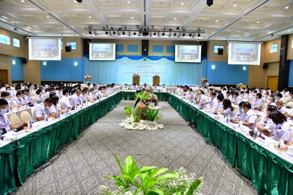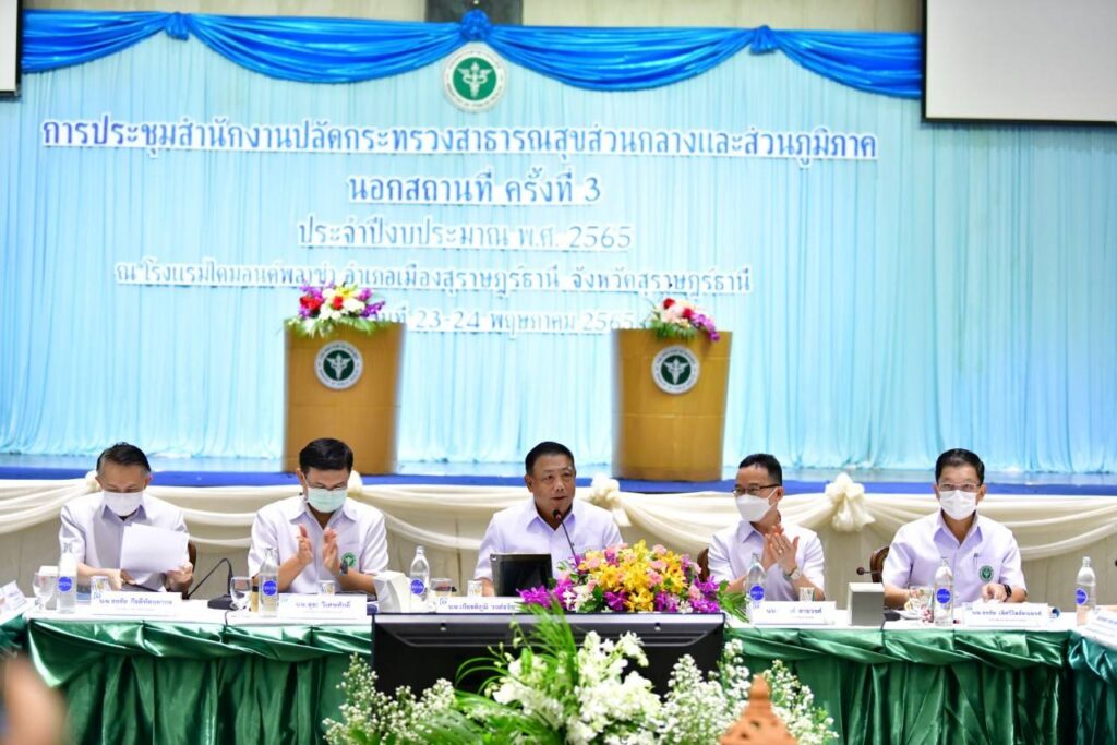 วันนี้ (24 พ.ค.65) ที่โรงแรมไดมอนด์ พลาซ่า จ.สุราษฎร์ธานี นพ.เกียรติภูมิ วงศ์รจิต ปลัดกระทรวงสาธารณสุข เป็นประธานการประชุมสำนักงานปลัดกระทรวงสาธารณสุข ส่วนกลางและส่วนภูมิภาค นอกสถานที่ ครั้งที่ 3 ประจำปีงบประมาณ 2565 ติดตามความคืบหน้าการดำเนินงานสำคัญ รวมทั้งการเตรียมการของพื้นที่เพื่อรับการเปลี่ยนผ่านโรคโควิด-19 เข้าสู่การเป็นโรคประจำถิ่น โดยระบุว่า ปัจจุบันสถานการณ์ดีขึ้นต่อเนื่องและเร็วกว่าฉากทัศน์ที่คาดการณ์ มั่นใจว่าจะเข้าสู่การเป็นโรคประจำถิ่นตามเวลาที่วางแผนไว้ หน่วยงานสาธารณสุขในพื้นที่จึงต้องมีการบริหารด้านสังคมร่วมด้วย โดยนำร่องกิจกรรมในการใช้ชีวิตอยู่ร่วมกับโควิด-19 อย่างปลอดภัยเพื่อสร้างความมั่นใจกับประชาชน