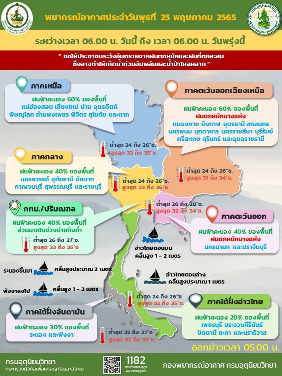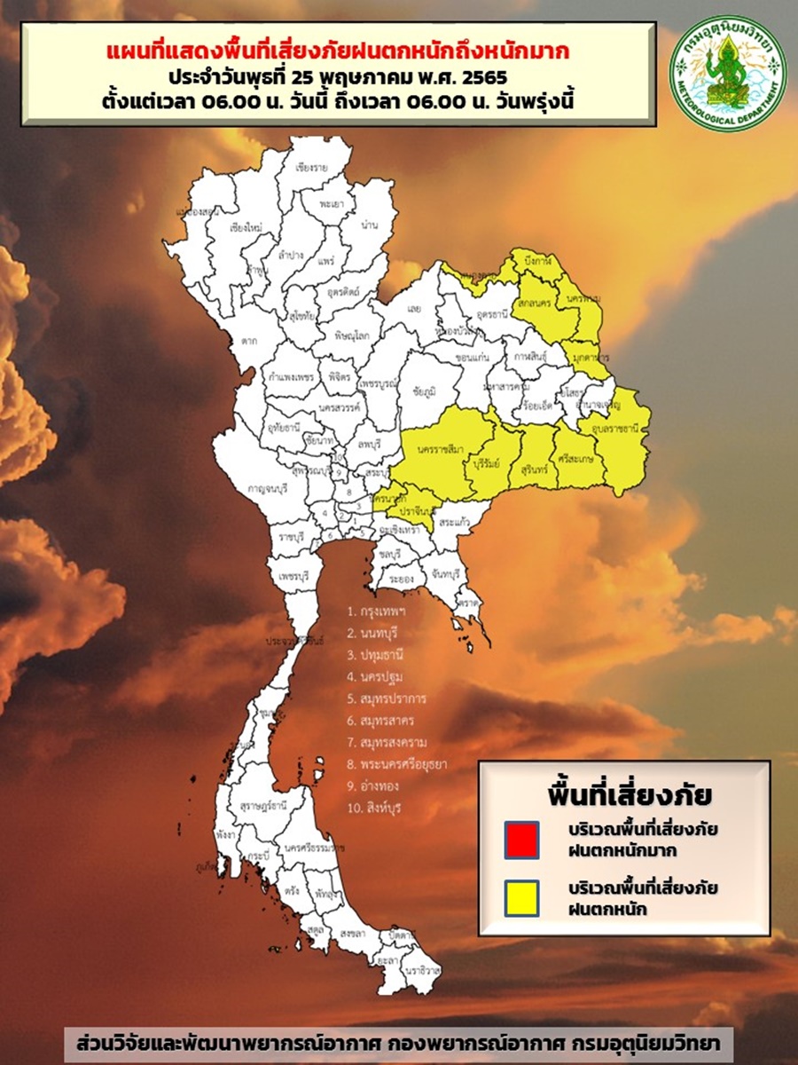 กรมอุตุฯ 25 พ.ค. – กรมอุตุฯ เผยภาคอีสานและภาคตะวันออก ยังคงมีฝนตกหนักบางแห่ง ระวังน้ำท่วมฉับพลันและน้ำป่าไหลหลาก ส่วนกรุงเทพฯ และปริมณฑล ฝนฟ้าคะนอง 40% ของพื้นที่ ช่วงบ่ายถึงค่ำ