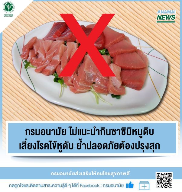 นพ.สุวรรณชัย วัฒนายิ่งเจริญชัย อธิบดีกรมอนามัย กล่าวว่า จากกรณีในโลกโซเซียลมีการเผยแพร่เมนูซาชิมิหมูดิบสไตล์ญี่ปุ่นที่มีการจำหน่ายในร้านอาหารแห่งหนึ่งขณะนี้นั้น กรมอนามัยขอแนะนำให้เลือกกินเมนูแบบปรุงสุกปลอดภัยกว่า เพราะการบริโภคเนื้อหมู เครื่องในหมู หรือเลือดหมูที่ไม่ได้ผ่านการปรุงสุกมาก่อน หรือแบบสุก ๆ ดิบ ๆ อาจเสี่ยงต่อการได้รับเชื้อแบคทีเรียสเตร็ปโตค็อกคัส ซูอิส (Streptococcus suis) หรือโรคไข้หูดับได้ ซึ่งหากได้รับเชื้อชนิดนี้จะทำให้มีอาการมีไข้ ปวดศีรษะ คลื่นไส้ อาเจียน บางรายแสดงอาการไข้ร่วมกับมีผื่น อุจจาระร่วง บางรายติดเชื้อที่เยื่อหุ้มหัวใจ เยื่อหุ้มสมอง รวมถึงอาจทำให้ติดเชื้อในกระแสเลือดอย่างรุนแรงถึงขั้นเสียชีวิตได้