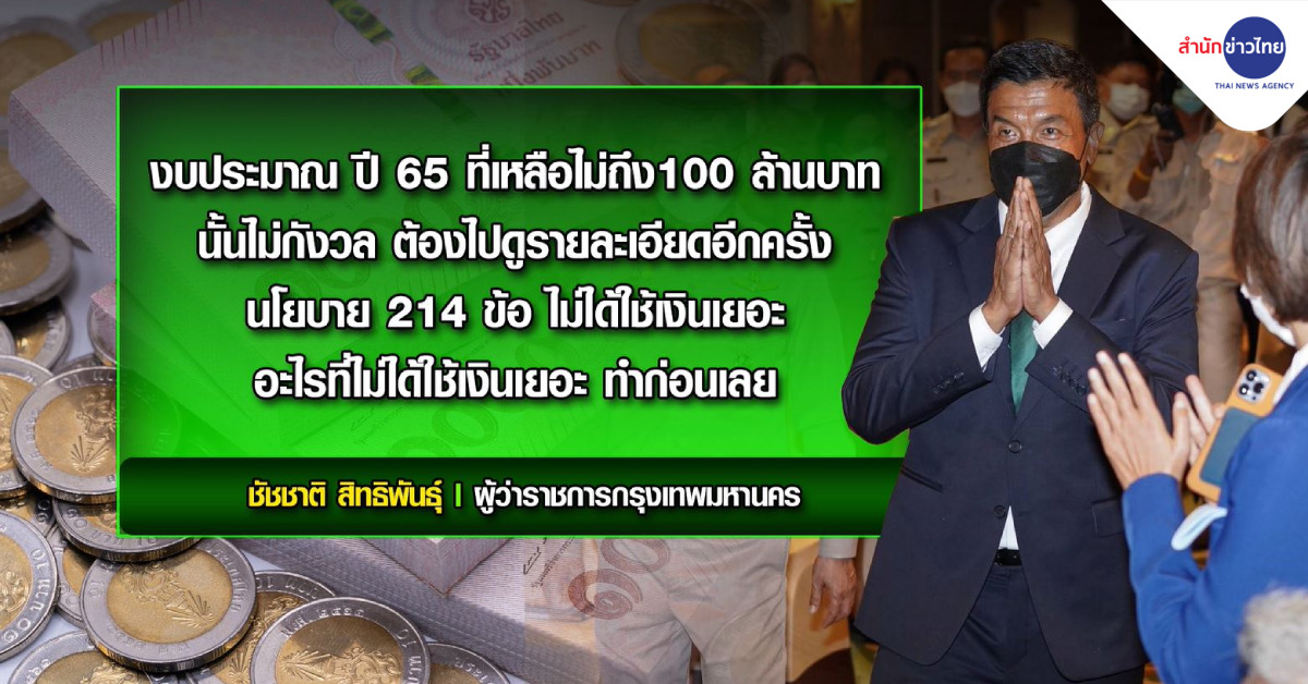 กทม. 1 มิ.ย. – “ชัชชาติ” ไม่กังวลงบประมาณ กทม. ปี 65 เหลือไม่ถึง 100 ล้าน มั่นใจนโยบาย 214 ข้อ ไม่ได้ใช้เงินเยอะ
