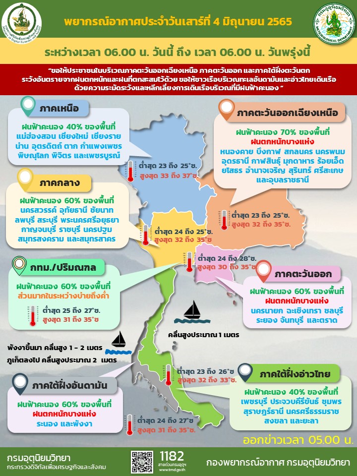 กรมอุตุนิยมวิทยา เผยมรสุมตะวันตกเฉียงใต้กำลังปานกลางพัดปกคลุมทะเลอันดามัน ประเทศไทย และอ่าวไทย ในขณะที่มีหย่อมความกดอากาศต่ำปกคลุมบริเวณประเทศเวียดนามตอนบนและประเทศจีนตอนใต้ ลักษณะเช่นนี้ทำให้ประเทศไทยยังคงมีฝนฟ้าคะนองเกิดขึ้นได้ โดยมีฝนตกหนักบางแห่ง บริเวณภาคตะวันออกเฉียงเหนือ ภาคตะวันออก และภาคใต้ฝั่งตะวันตก ขอให้ประชาชนในบริเวณดังกล่าวระวังอันตรายจากฝนตกหนักและฝนที่ตกสะสมไว้ด้วย