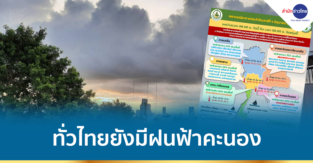 กทม. 4 มิ.ย.- กรมอุตุฯ เผยทั่วไทยยังมีฝนฟ้าคะนองและตกหนักบางแห่ง ส่วนกรุงเทพฯ – ปริมณฑล ฝนร้อยละ 60 ช่วงบ่ายถึงค่ำ