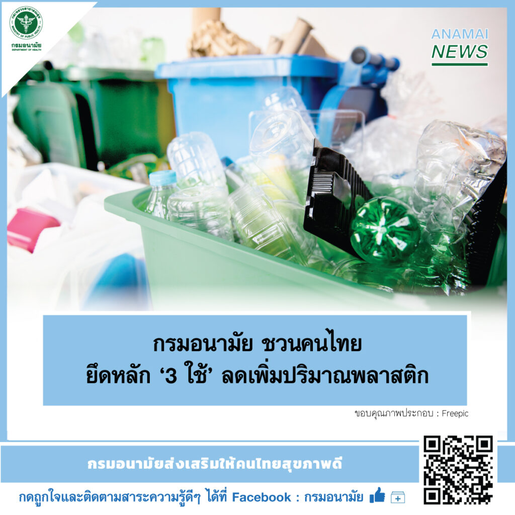 สธ. 4 มิ.ย.- กรมอนามัย กระทรวงสาธารณสุข แนะคนไทยยึดหลัก 3 ใช้ คือ ใช้น้อย (Reduce) ใช้ซ้ำ (Reuse) และใช้ใหม่ (Recycle) ลดการเพิ่มปริมาณพลาสติก ลดผลกระทบด้านสิ่งแวดล้อมและสุขภาพ