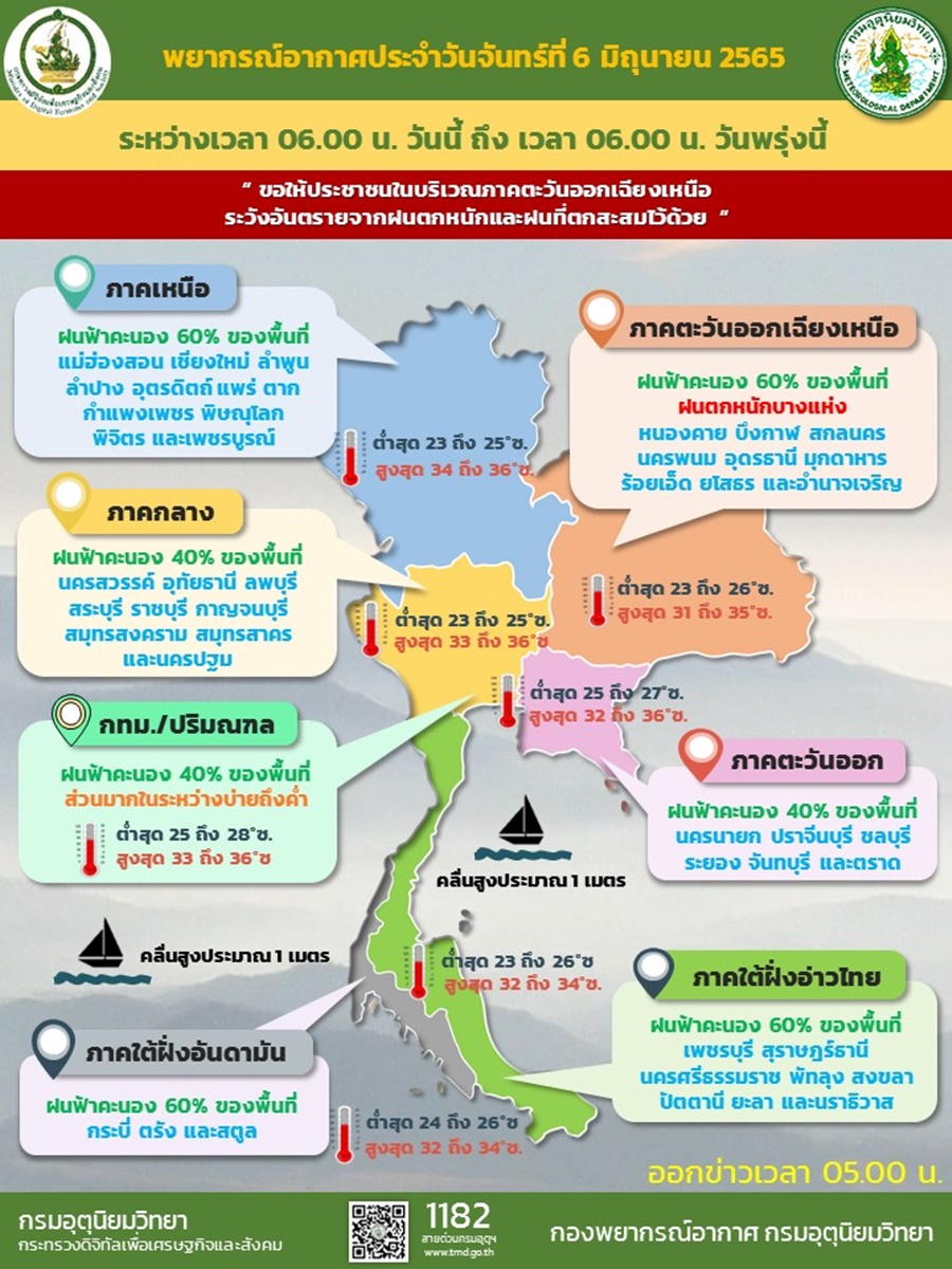 กรมอุตุนิยมวิทยา พยากรณ์อากาศ 24 ชั่วโมงข้างหน้า มรสุมตะวันตกเฉียงใต้กำลังปานกลางพัดปกคลุมทะเลอันดามัน ประเทศไทย และอ่าวไทย ในขณะที่มีหย่อมความกดอากาศต่ำปกคลุมประเทศเวียดนามตอนบนและอ่าวตังเกี๋ย ลักษณะเช่นนี้ทำให้ประเทศไทยยังคงมีฝนฟ้าคะนอง โดยมีฝนตกหนักบางแห่ง บริเวณภาคตะวันออกเฉียงเหนือ ขอให้ประชาชนในบริเวณดังกล่าวระวังอันตรายจากฝนตกหนักและฝนที่ตกสะสมไว้ด้วย ส่วนคลื่นลมบริเวณอ่าวไทยและทะเลอันดามัน มีคลื่นสูงประมาณ 1 เมตร บริเวณที่มีฝนฟ้าคะนองคลื่นสูงมากกว่า 1 เมตร