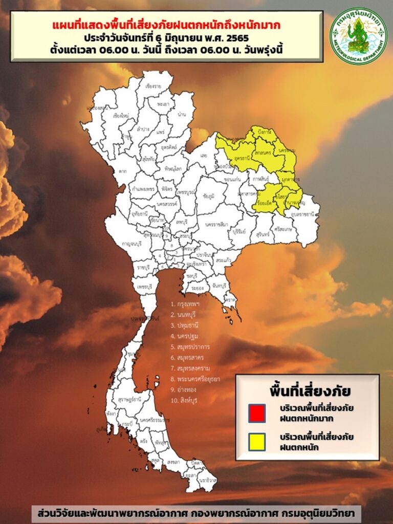 กรมอุตุฯ 6 มิ.ย. – กรมอุตุฯ เผยทั่วไทยยังคงมีฝนฟ้าคะนอง โดยมีฝนตกหนักบางแห่งในภาคอีสาน ส่วนกรุงเทพฯ และปริมณฑล ฝนฟ้าคะนอง 40% ของพื้นที่ ช่วงบ่ายถึงค่ำ