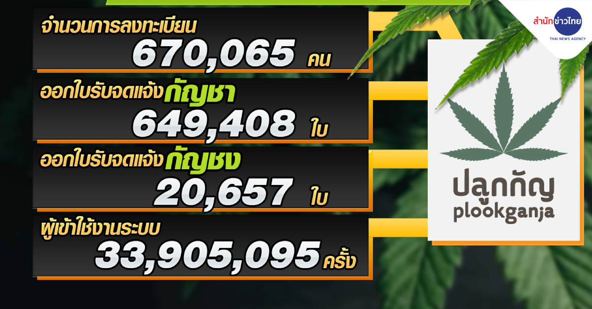 หลังสำนักงานคณะกรรมการอาหารและยา หรือ อย. เปิดให้มีการจดแจ้งการปลูกกัญชาและกัญชง ผ่านเว็บไซต์ และแอปพลิเคชัน “ปลูกกัญ”ตั้งแต่มีการปลดล็อกกัญชา เมื่อวันที่ 9 มิถุนายน ที่ผ่านมา ล่าสุดมีผู้ลงทะเบียนแล้วกว่า 670,000 คน ทาง อย. พิจารณาและออกใบรับจดแจ้งกัญชาให้แล้ว กว่า 640,000 ใบ ส่วนกัญชง มีการออกใบจดแจ้งให้แล้วกว่า 20,000 ใบ จากจำนวนผู้เข้าใช้งานในระบบกว่า 33.9 ล้านครั้ง