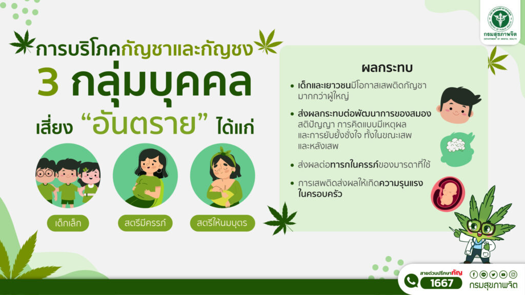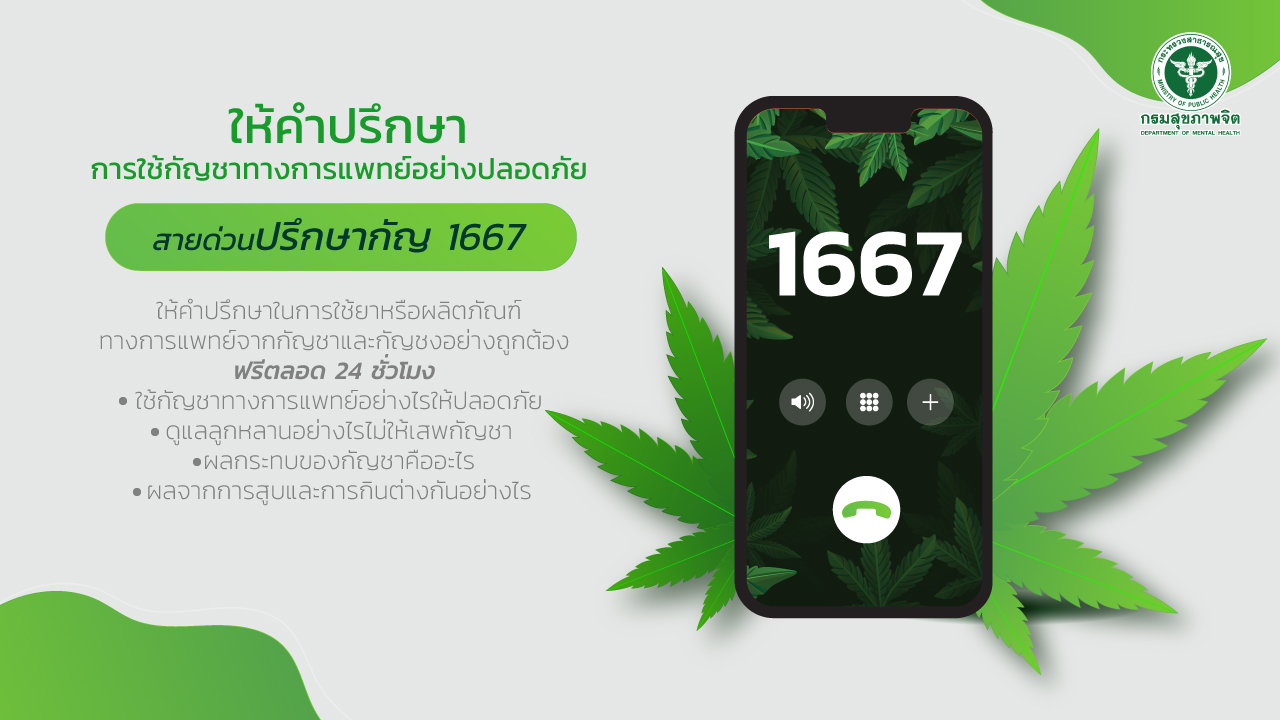 กรมสุขภาพจิต 14 มิ.ย.- กรมสุขภาพจิต เตือน 3 กลุ่ม ไม่ควรใช้กัญชาเด็ดขาด เดินหน้าเปิดสายด่วน “ปรึกษากัญ 1667” ให้คำปรึกษาในการใช้กัญชาทางการแพทย์อย่างปลอดภัย ไม่เสพติด ไม่เจ็บป่วยทางจิต