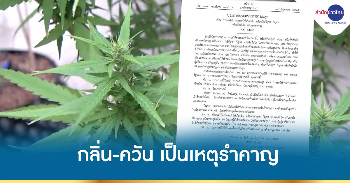 นายแพทย์สุวรรณชัย วัฒนายิ่งเจริญชัย อธิบดีกรมนามัย เปิดเผยว่า ขณะนี้ประกาศกระทรวงสาธารณสุข เรื่อง กำหนดให้การกระทำให้เกิดกลิ่น หรือควันกัญชา กัญชง หรือพืชอื่นใด เป็นเหตุรำคาญ พ.ศ. 2565 ซึ่งลงนามโดยรัฐมนตรีช่วยว่าการกระทรวงสาธารณสุข (ดร.สาธิต ปิตุเตชะ) ได้ประกาศในราชกิจจานุเบกษา เมื่อวันที่ 14 มิถุนายน 2565 ที่ผ่านมา โดยมีผลบังคับใช้ตั้งแต่ 15 มิถุนายน 2565 เป็นต้นไป ซึ่งเนื้อหาในประกาศกำหนดให้การกระทำให้เกิดกลิ่น หรือควันกัญชา กัญชง หรือพืชอื่นใด เป็นเหตุรำคาญ เนื่องจากการใช้กัญชา กัญชง หรือพืชอื่นใด ในทางที่ไม่เหมาะสม เช่น สันทนาการ อาจส่งผลกระทบต่อสภาวะความเป็นอยู่โดยปกติสุข หรืออาจเป็นอันตรายต่อสุขภาพ โดยควันของพืชดังกล่าว จะมีอนุภาคขนาดเล็กที่สามารถเข้าสู่ปอดได้ด้วยการหายใจเอาควันเข้าไป ทำให้มีความเสี่ยงต่อการเจ็บป่วย เช่น โรคปอด หอบหืด หลอดลมอักเสบ เพื่อควบคุมและป้องกันไม่ให้เกิดผลกระทบจนเป็นเหตุให้เสื่อม หรืออาจเป็นอันตรายต่อสุขภาพของผู้อยู่อาศัยบริเวณใกล้เคียง หรือผู้ที่ต้องประสบภัยกับเหตุนั้น สมควรกำหนดให้การกระทำให้เกิดกลิ่น หรือควันกัญชา กัญชง หรือพืชอื่นใด เป็นเหตุรำคาญ ตามกฎหมายว่าด้วยการสาธารณสุข