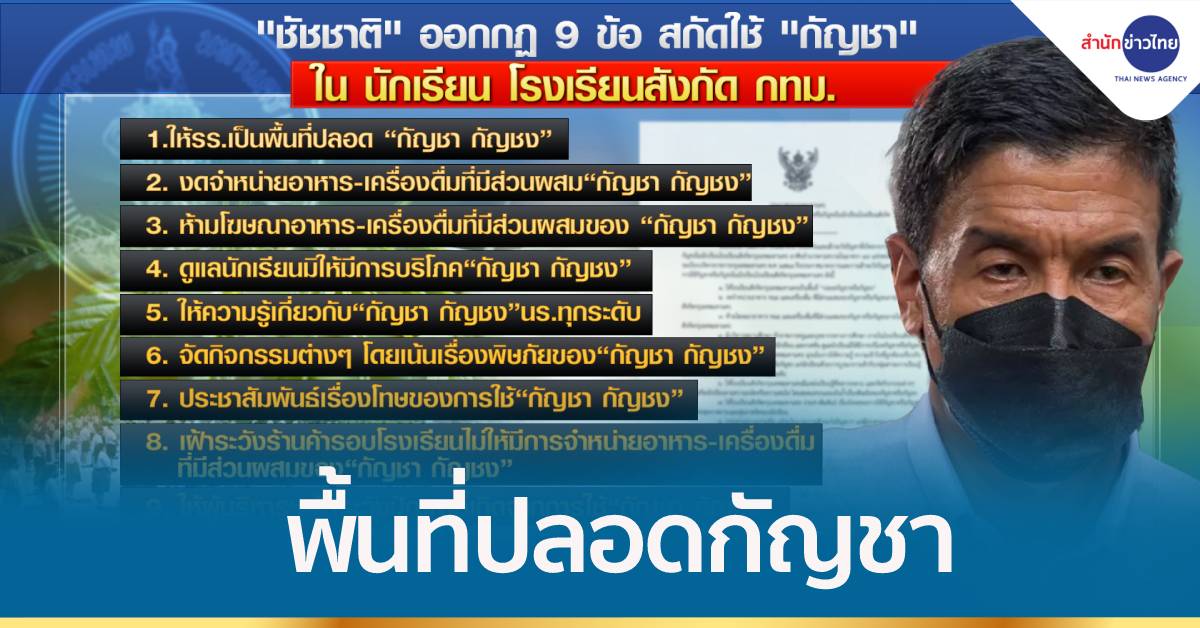 9.ให้ผู้บริหารสถานศึกษาในโรงเรียนสังกัดกรุงเทพมหานคร ประสานความร่วมมือกับสำนักการแพทย์ สำนักอนามัย สำนักการศึกษา และสำนักงานเขต เพื่อบูรณาการการป้องกันและเฝ้าระวัง ปัญหาที่เกิดจากการใช้กัญชาหรือกัญชงในโรงเรียนสังกัดกรุงเทพมหานครอย่างใกล้ชิด โดยให้ประกาศนี้มีผลในทันที. – สำนักข่าวไทย