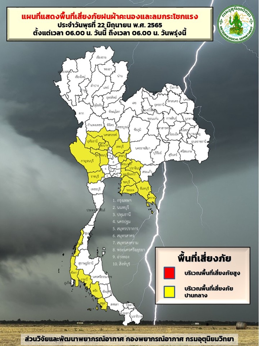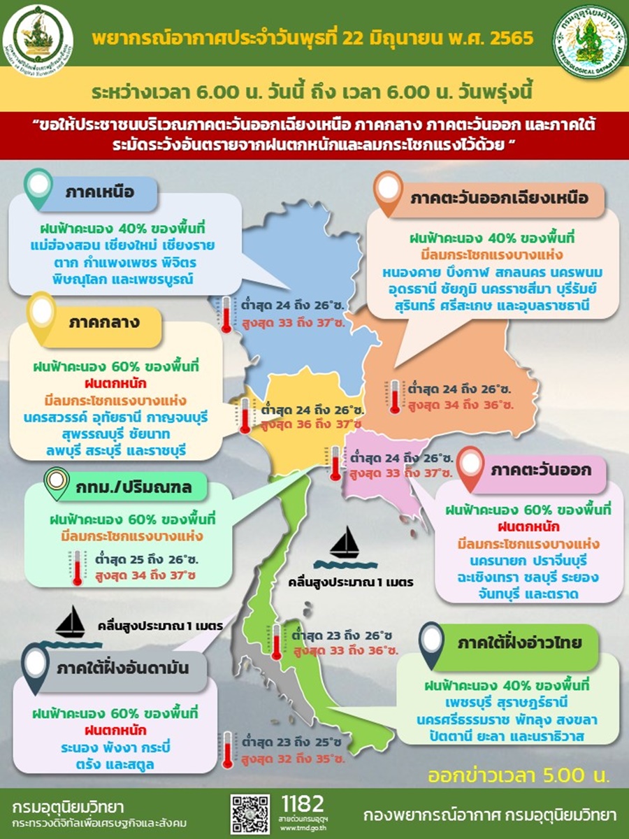 กรมอุตุฯ 22 มิ.ย. – กรมอุตุฯ เผยไทยมีฝนฟ้าคะนองบางพื้นที่ โดยมีฝนตกหนักและลมกระโชกแรงบางแห่ง บริเวณภาคอีสาน ภาคกลาง ภาคตะวันออก และภาคใต้ ส่วนกรุงเทพฯ และปริมณฑล ฝนฟ้าคะนอง 60% ของพื้นที่