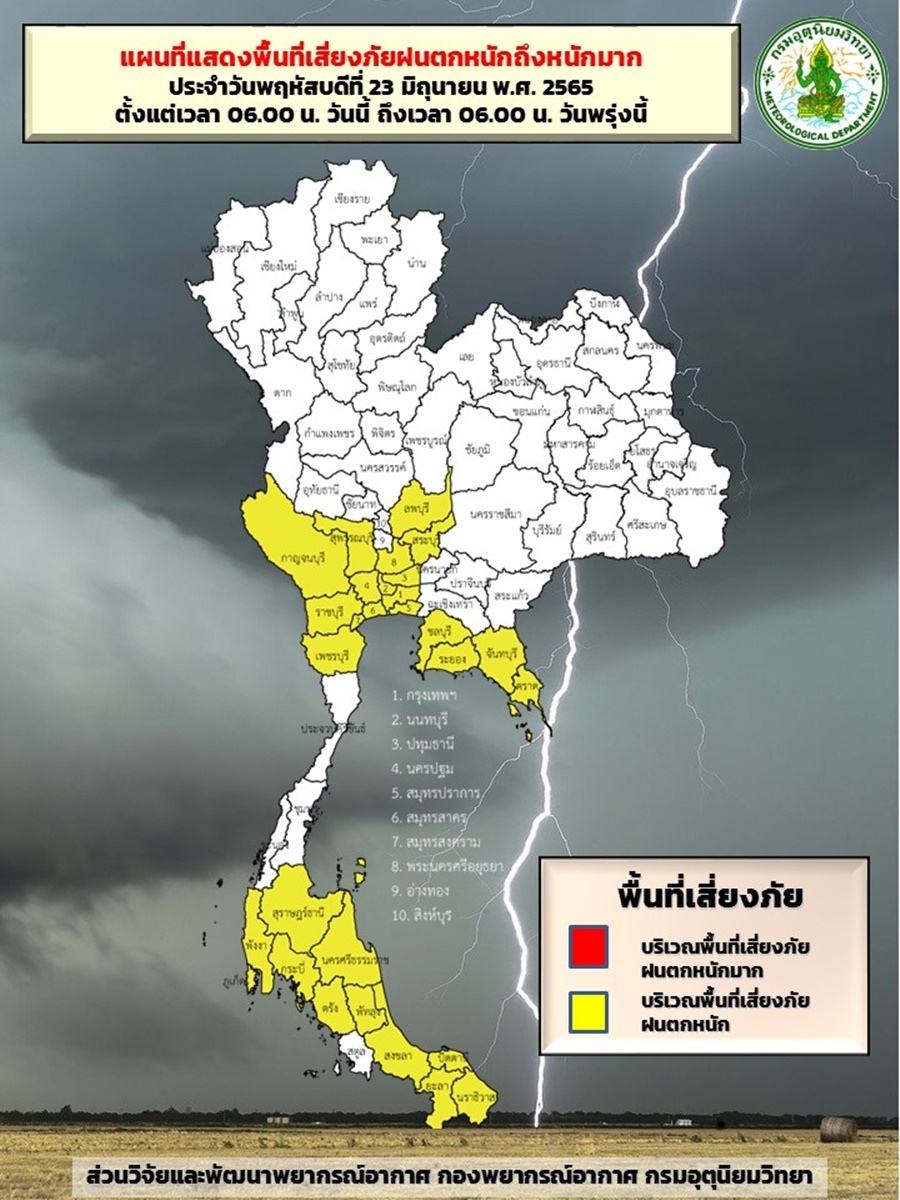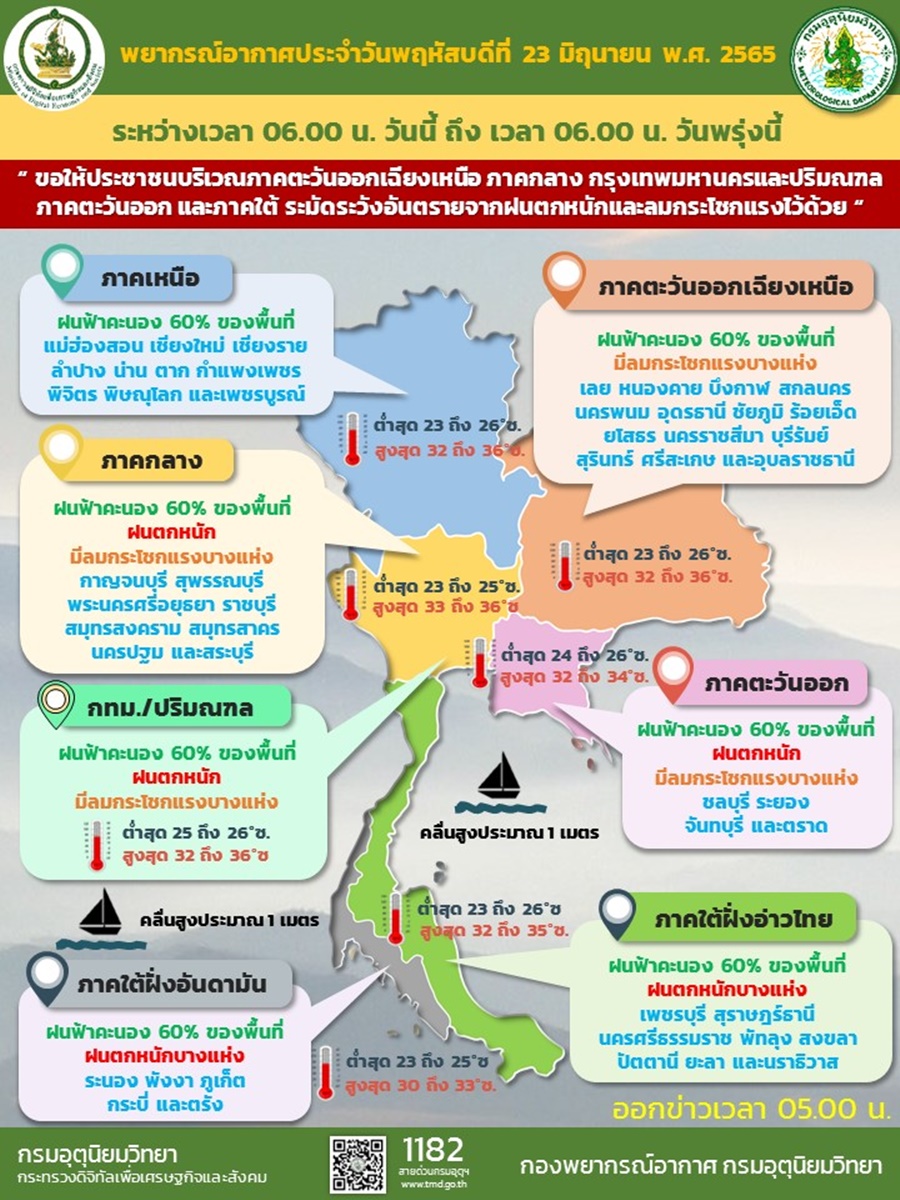 กรมอุตุฯ 23 มิ.ย. – กรมอุตุฯ เผยไทยมีฝนฟ้าคะนอง โดยมีฝนตกหนักและลมกระโชกแรงบางแห่ง บริเวณภาคกลาง ภาคตะวันออก ภาคใต้ รวมทั้งกรุงเทพฯ และปริมณฑล