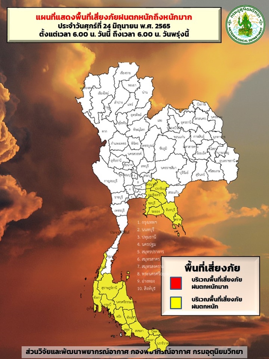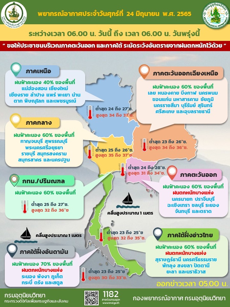 กรมอุตุนิยมวิทยา พยากรณ์อากาศ 24 ชั่วโมงข้างหน้า มรสุมตะวันตกเฉียงใต้พัดปกคลุมทะเลอันดามัน ประเทศไทย และอ่าวไทย ประกอบกับมีหย่อมความกดอากาศต่ำปกคลุมประเทศเวียดนามตอนบน ทำให้ประเทศไทยมีฝนฟ้าคะนอง และมีฝนตกหนักบางแห่ง บริเวณภาคตะวันออก และภาคใต้ ขอให้ประชาชนระมัดระวังอันตรายจากฝนตกหนัก ส่วนคลื่นลมบริเวณทะเลอันดามันและอ่าวไทยมีกำลังอ่อน โดยมีคลื่นสูงประมาณ 1 เมตร บริเวณที่มีฝนฟ้าคะนองคลื่นสูง 1-2 เมตร ขอให้ชาวเรือ ในบริเวณดังกล่าวเดินเรือด้วยความระมัดระวังบริเวณที่มีฝนฟ้าคะนองในระยะนี้