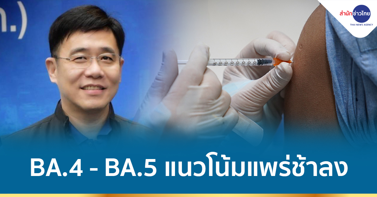 นพ.รุ่งเรือง กล่าวอีกว่าภาพรวมของโอไมครอน BA.4 และ BA.5 ขณะนี้มีแนวโน้มแพร่ลดลง และพบในคนที่เดินทางจากต่างประเทศเข้าไทยมากกว่าในไทยอย่างมีนัยสำคัญ ยืนยัน สธ.มีระบบเฝ้าระวังติดตามใกล้ชิด และยังไม่มีข้อมูลสรุปว่าเชื้อ BA.4 และ BA.5 รุนแรงขึ้น .-สำนักข่าวไทย