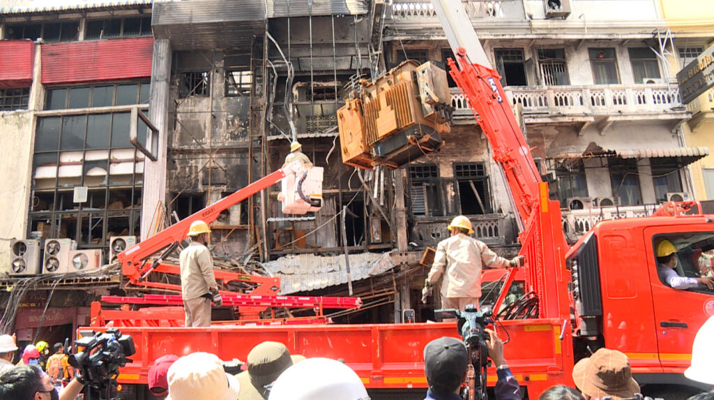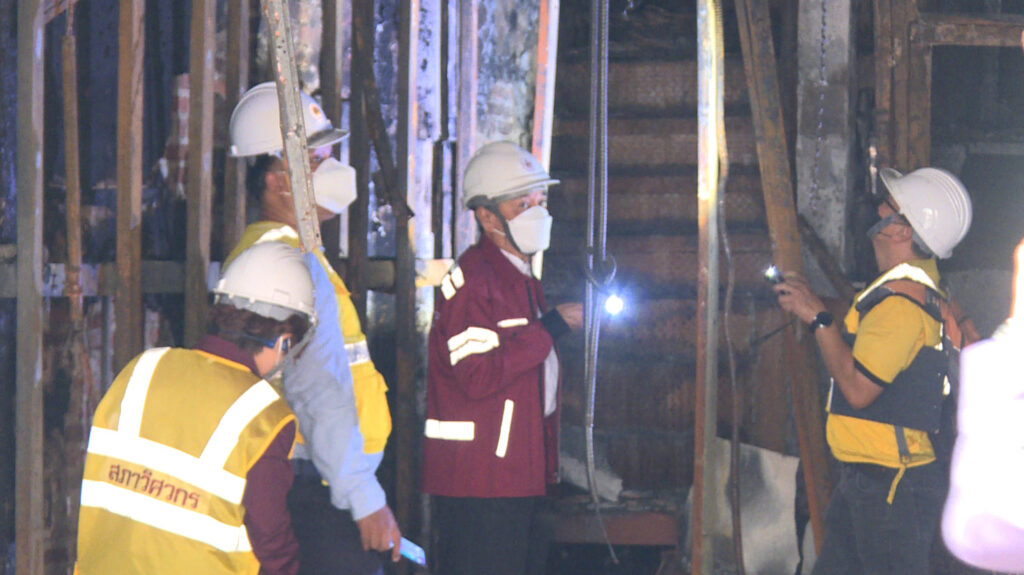 ดร.ธเนศ วีระศิริ นายก วสท. กล่าวว่า จากการตรวจสอบจุดเกิดเหตุ โดยวิศวกรได้เข้าไปตรวจสอบอาคารพาณิชย์ที่ถูกไฟไหม้ หลังประเมินพบว่าโครงสร้างของอาคารที่เห็นภายนอกสามารถให้เจ้าหน้าที่ทั้งสำนักโยธาและเจ้าหน้าที่พิสูจน์หลักฐานเข้าไปสำรวจ และเก็บหลักฐานภายในอาคารได้ และจากการตรวจสอบภายในพบว่าห้องที่ 1 และ 2 ปีกซ้ายของอาคารเป็นจุดที่ได้รับความเสียหายมากที่สุด เนื่องจากผนังของอาคารเป็นอิฐก่อเสริมโครงเหล็กทำเป็นชั้นของ เมื่อเจอความร้อนเหล็กจึงเสียรูป ทำให้พื้นแอ่นตัวลามไปจนถึงชั้น 3 และความร้อนยังแผ่ไปจนถึงผนังด้านหลังอาคารจนบิดตัวเช่นกัน ส่วนห้องที่ 3 ใกล้กับหม้อแปลงความเสียหายไม่มาก เนื่องจากโครงสร้างเป็นคอนกรีตเสริมเหล็ก หลังจากนี้ต้องตรวจสอบตามหลักวิศวกรเพื่อปรับปรุง แต่มีโอกาสที่จะทำให้กลับมายากต้องปรึกษาทาง กทม.ด้วย