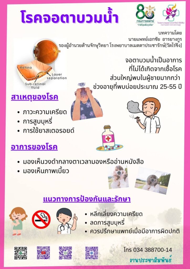 นพ.ไพโรจน์ สุรัชวนิช รองอธิบดีกรมการแพทย์ กล่าวว่า โรคทางตานอกจากสาเหตุจากเชื้อโรครอบตัวเราแล้ว อาจเกิดจากภาวะผิดปกติของร่างกายได้เช่นกัน อาทิ โรคจอตาบวมน้ำที่ไม่ได้มีสาเหตุการเกิดจากเชื้อโรค พบได้ในผู้ที่มีอายุ 25-55 ปี เพศชายมากกว่าเพศหญิง และกลุ่มผู้ที่จริงจังกับชีวิตและเครียดง่าย การใช้ยารักษาโรคบางชนิด โดยเฉพาะยากลุ่มสเตอรอยด์