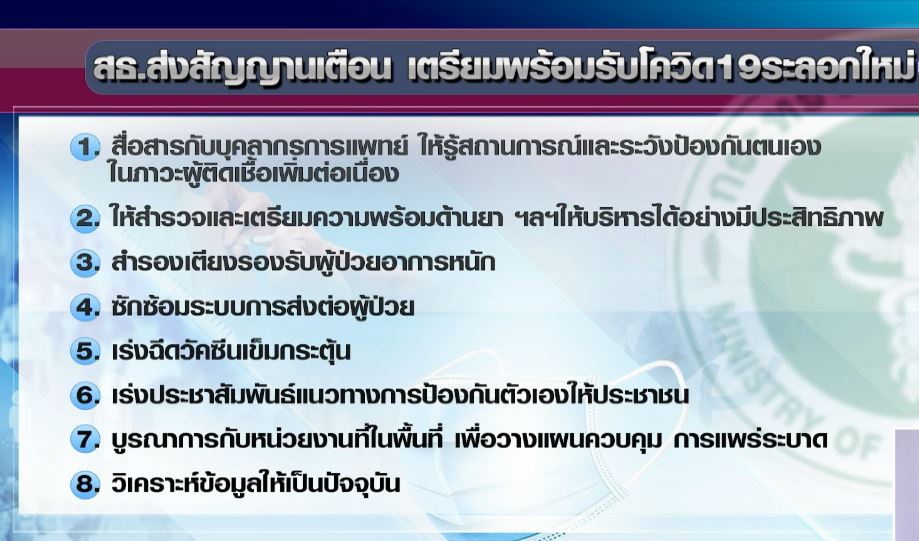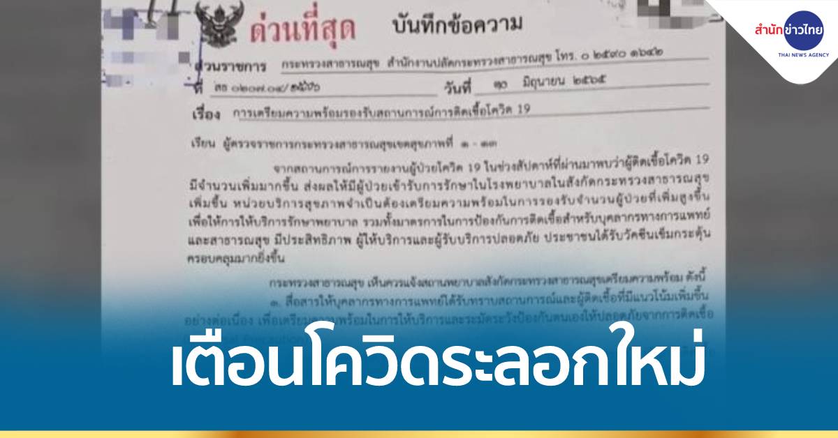 กรุงเทพฯ 5 ก.ค.- ประสานเสียงเตือนรับมือโควิดระบาดระลอกใหม่ จำนวนผู้ติดเชื้อพุ่ง สธ.ส่งหนังสือถึงทุกจังหวัด เตรียมพร้อมรับสถานการณ์โควิดระลอกใหม่ ขณะที่อธิบดีกรมควบคุมโรค แจงเป็นการแจ้งเตือนตามมาตรการปกติ ด้าน “อนุทิน” ชี้เปิดประเทศผู้ติดเชื้อเพิ่ม แต่ยังรับมือได้