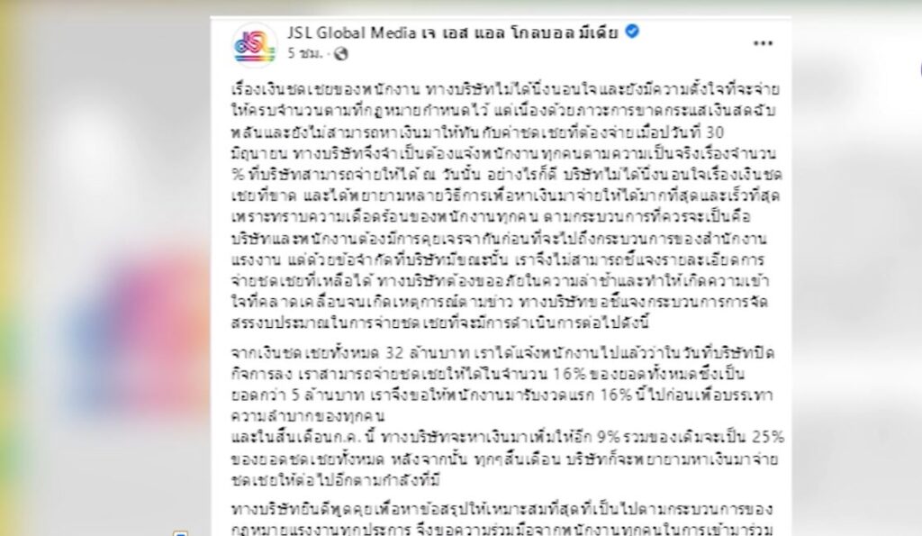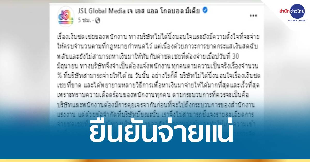 บริษัท เจ เอส แอล โกลบอล มีเดีย จำกัด หรือ JSL โพสต์ชี้แจงผ่านเฟซบุ๊ก กรณีเงินชดเชยของพนักงานที่ถูกลอยแพฟ้าผ่า ว่าเรื่องเงินชดเชยของพนักงาน ทางบริษัทไม่ได้นิ่งนอนใจ และยังมีความตั้งใจที่จะจ่ายให้ครบจำนวนตามที่กฎหมายกำหนดไว้ แต่เนื่องด้วยภาวะการขาดกระแสเงินสดฉับพลัน และยังไม่สามารถหาเงินมาให้ทันกับค่าชดเชยที่ต้องจ่ายเมื่อวันที่ 30 มิถุนายน บริษัทจึงจำเป็นต้องแจ้งพนักงานทุกคนตามความเป็นจริง เรื่องจำนวน % ที่บริษัทสามารถจ่ายให้ได้ ณ วันนั้น