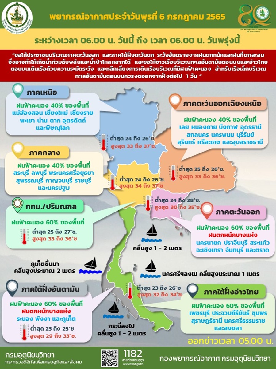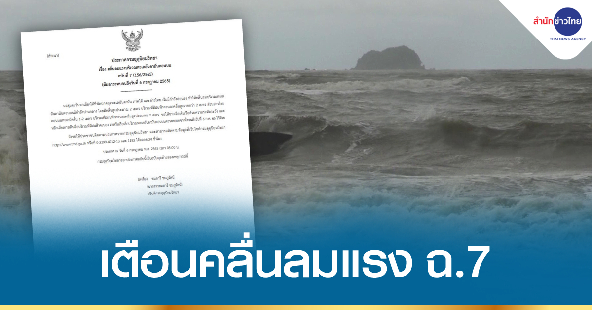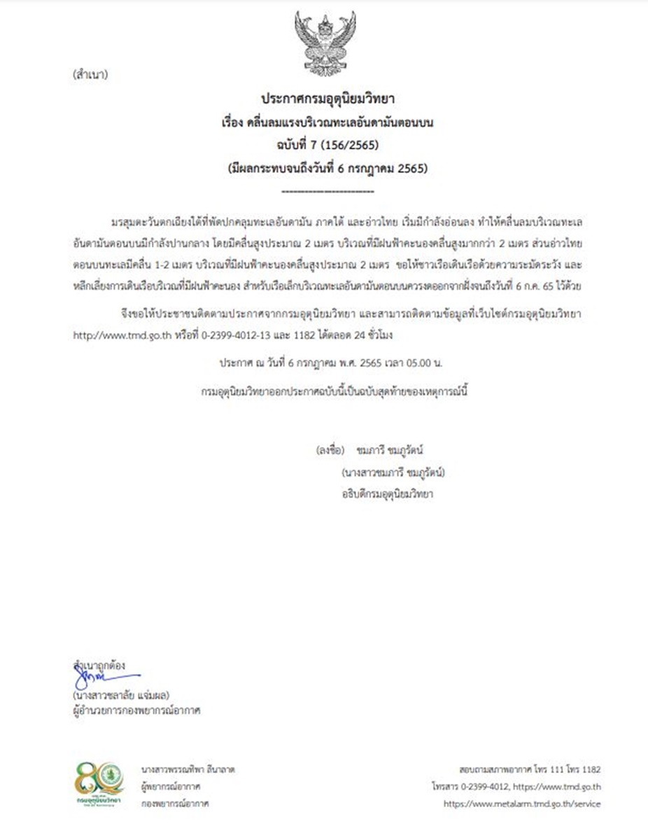 กรมอุตุนิยมวิทยา ออกประกาศ เรื่อง “คลื่นลมแรงบริเวณทะเลอันดามันตอนบน (มีผลกระทบจนถึงวันที่ 6 กรกฎาคม 2565)” ฉบับที่ 7 ลงวันที่ 6 กรกฎาคม 2565 ระบุว่า มรสุมตะวันตกเฉียงใต้ที่พัดปกคลุมทะเลอันดามัน ภาคใต้ และอ่าวไทย เริ่มมีกำลังอ่อนลง ทำให้คลื่นลมบริเวณทะเลอันดามันตอนบนมีกำลังปานกลาง โดยมีคลื่นสูงประมาณ 2 เมตร บริเวณที่มีฝนฟ้าคะนองคลื่นสูงมากกว่า 2 เมตร ส่วนอ่าวไทยตอนบนมีคลื่นสูง 1-2 เมตร บริเวณที่มีฝนฟ้าคะนองคลื่นสูงประมาณ 2 เมตร ขอให้ชาวเรือเดินเรือด้วยความระมัดระวัง และหลีกเลี่ยงการเดินเรือบริเวณที่มีฝนฟ้าคะนอง ส่วนเรือเล็กบริเวณทะเลอันดามันตอนบนควรงดออกจากฝั่ง
