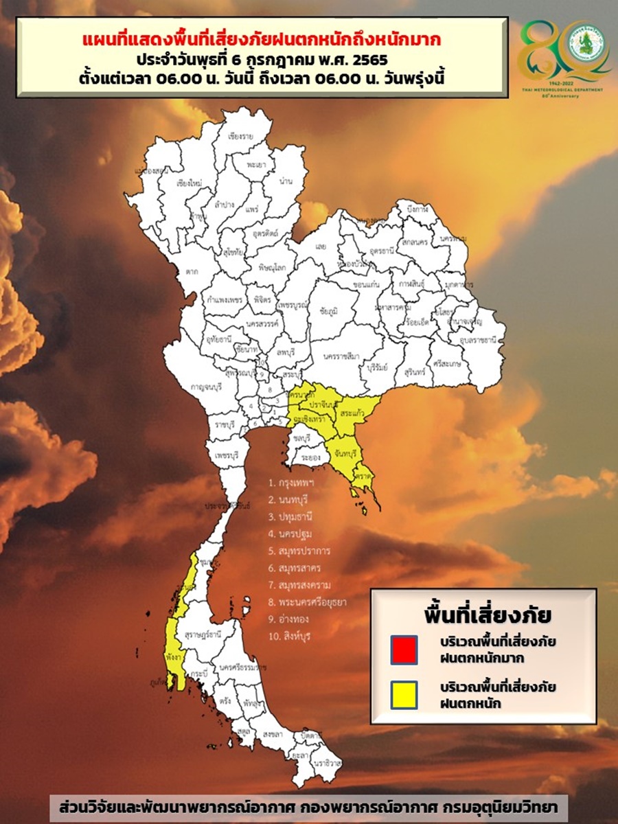 สำหรับพยากรณ์อากาศ 24 ชั่วโมงข้างหน้า มรสุมตะวันตกเฉียงใต้ที่พัดปกคลุมทะเลอันดามัน ประเทศไทย และอ่าวไทย เริ่มมีกำลังอ่อนลง ประกอบกับร่องมรสุมพาดผ่านประเทศเมียนมา ประเทศลาวตอนบน เข้าสู่หย่อมความกดอากาศต่ำบริเวณประเทศเวียดนามตอนบน ลักษณะเช่นนี้ยังคงทำให้ภาคตะวันออก และภาคใต้ฝั่งตะวันตก มีฝนตกหนักบางแห่ง ขอให้ประชาชนบริเวณดังกล่าวระวังอันตรายจากฝนตกหนักและฝนที่ตกสะสม ซึ่งอาจทำให้เกิดน้ำท่วมฉับพลันและน้ำป่าไหลหลากได้