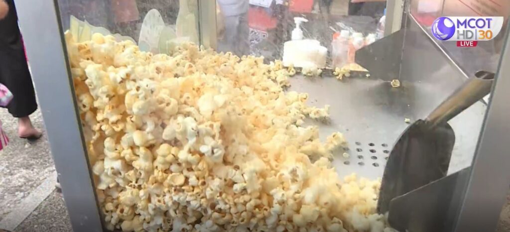 ส่วนรอบๆ ลานคนเมือง เต็มไปด้วยอาหารที่นำมาขาย สื่อให้หวนนึกถึงบรรยากาศในอดีต อย่างป๊อปคอร์น ถั่วต้ม ปลาหมึกย่าง รวมถึงอ้อยควั่น ที่ควั่นขายกันสดๆ รสชาติหวานหอม ประชาชนที่มานอกจากอยู่ใกล้แล้วๆ ยังมีหลายคนตั้งใจเดินทางมาไกลจากบ้าน บอกว่าวันนี้ทำให้คิดถึงบรรยากาศหนังกลางแปลงที่เคยชมสมัยเด็กๆ