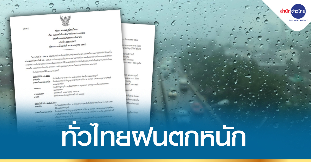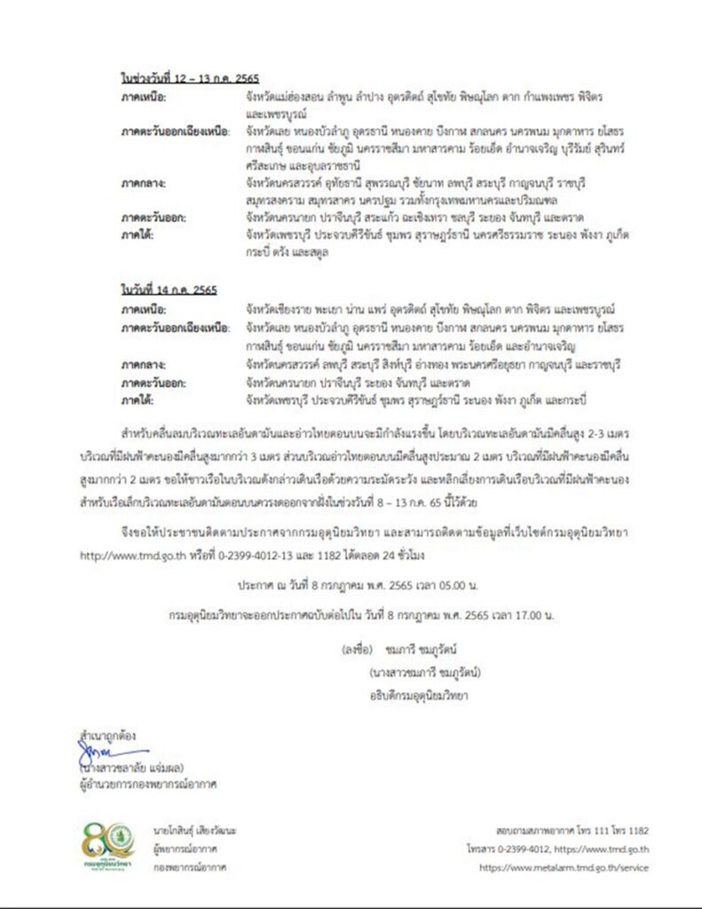 กรมอุตุนิยมวิทยา ออกประกาศ เรื่อง “ฝนตกหนักถึงหนักมากบริเวณประเทศไทย และคลื่นลมแรงบริเวณทะเลอันดามัน (มีผลกระทบตั้งแต่วันที่ 9-14 กรกฎาคม 2565)” ฉบับที่ 3 ลงวันที่ 8 กรกฎาคม 2565 ระบุว่า ในช่วงวันที่ 9-14 ก.ค.65 มรสุมตะวันตกเฉียงใต้ที่พัดปกคลุมทะเลอันดามัน ประเทศไทย และอ่าวไทย จะมีกำลังแรงขึ้น ประกอบกับในช่วงวันที่ 10-14 ก.ค.65 ร่องมรสุมจะเลื่อนลงมาพาดผ่านภาคเหนือ ภาคตะวันออกเฉียงเหนือตอนบน เข้าสู่หย่อมความกดอากาศต่ำกำลังแรงบริเวณทะเลจีนใต้ตอนบน ทำให้ประเทศไทยจะมีฝนเพิ่มขึ้น โดยมีฝนตกหนักถึงหนักมากบางแห่ง บริเวณภาคเหนือ ภาคตะวันออกเฉียงเหนือ ภาคกลาง รวมทั้งกรุงเทพมหานคร และปริมณฑล ภาคตะวันออก และภาคใต้