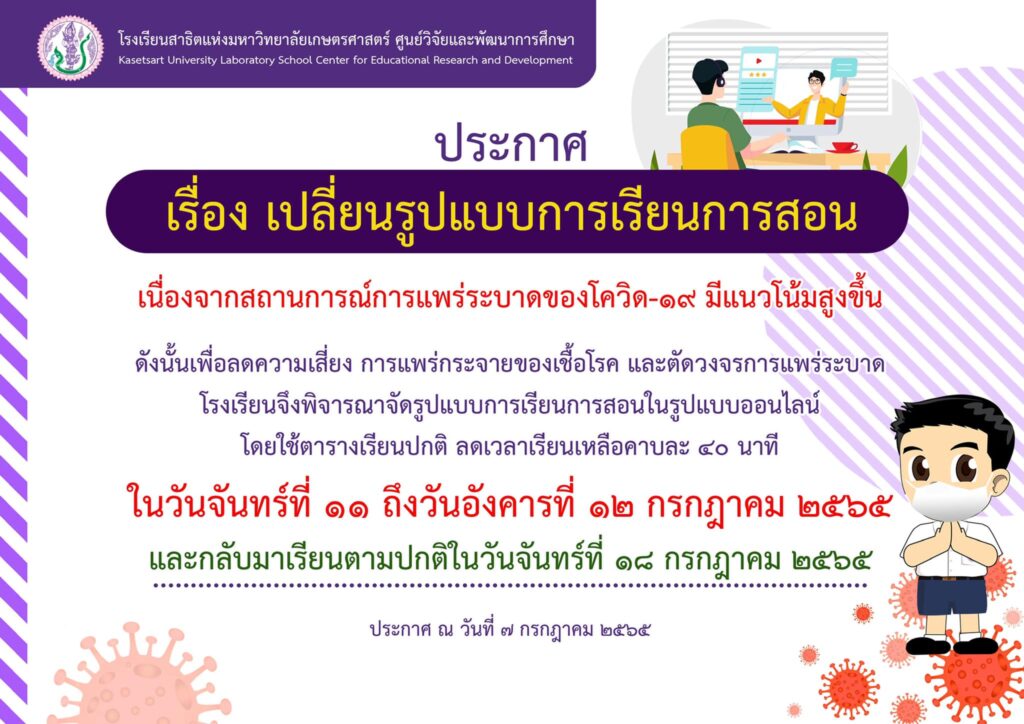โรงเรียนต่อมาคือ โรงเรียนสาธิตแห่งมหาวิทยาลัยเกษตรศาสตร์ ออกประกาศเรื่อง การเปลี่ยนรูปแบบการเรียนการสอน โดยระบุว่า เนื่องจากสถานการณ์การแพร่ระบาดของโควิดมีแนวโน้มสูงขึ้น เพื่อลดความเสี่ยงการแพร่กระจายของเชื้อโรคและตัดวงจรการแพร่ระบาด โรงเรียนจึงพิจารณาจัดรูปแบบการเรียนการสอนในรูปแบบออนไลน์ ตั้งแต่วันจันทร์ที่ 11-12 กรกฎาคม และกลับมาเรียนปกติในวันจันทร์ที่ 18 กรกฎาคม