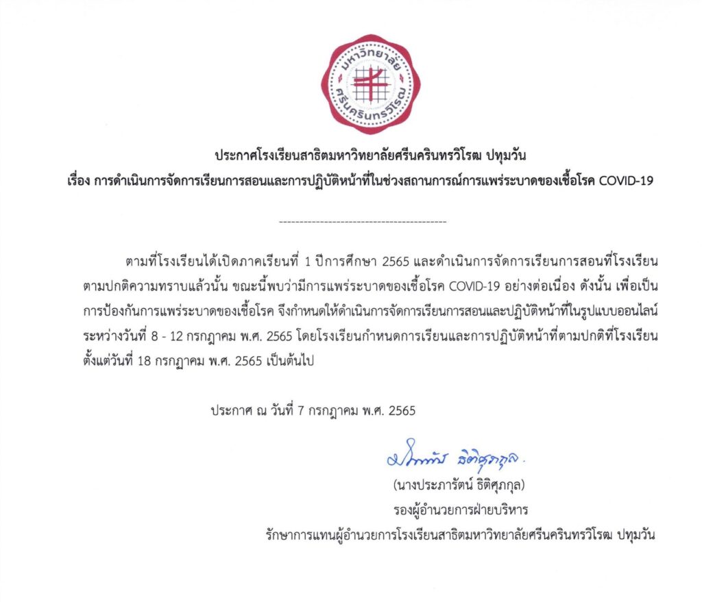 โรงเรียนสาธิตมหาวิทยาลัยศรีนครินทรวิโรฒ ปทุมวัน ออกประกาศการเปลี่ยนแปลงรูปแบบการเรียนการสอน ตั้งแต่วันนี้ (8 ก.ค.) ไปจนถึงวัน 12 กรกฎาคม เป็นการเรียนการสอนแบบออนไลน์ เนื่องมาจากมีการแพร่ระบาดของโควิดอย่างต่อเนื่อง เพื่อเป็นการป้องกันการแพร่ระบาดของเชื้อโรค จึงกำหนดให้ดำเนินการจัดการเรียนการสอนและปฏิบัติหน้าที่ในรูปแบบออนไลน์ ระหว่างวันที่ 8-12 กรกฎาคม โดยโรงเรียนกำหนดการเรียนและการปฏิบัติหน้าที่ตามปกติที่โรงเรียน ตั้งแต่วันที่ 18 กรกฎาคมเป็นต้นไป