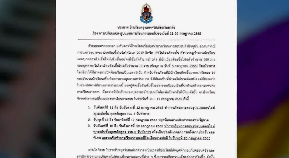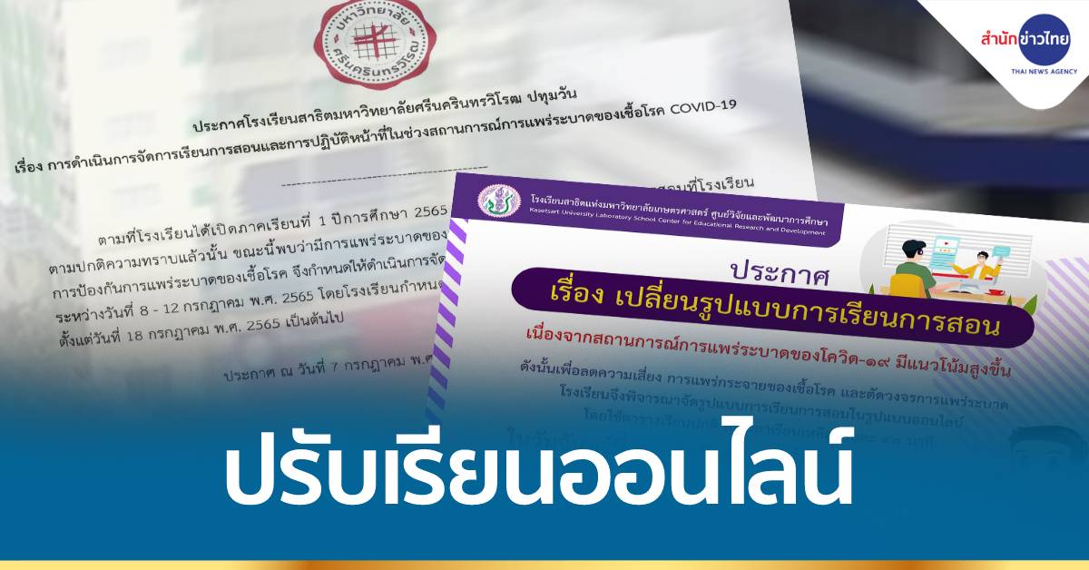 กรุงเทพฯ 8 ก.ค.- 3 โรงเรียนดัง “กรุงเทพคริสเตียนฯ-สาธิตเกษตรฯ-สาธิต มศว ปทุมวัน” ออกประกาศเปลี่ยนรูปแบบการเรียนการสอนเป็นออนไลน์ หลังสถานการณ์แพร่ระบาดของโควิด-19 กลับมามีแนวโน้มสูงขึ้น โดย ก.สาธารณสุข สั่งกำชับโรงเรียนเข้มมาตรการ หลังพบการระบาดหนักในเด็ก