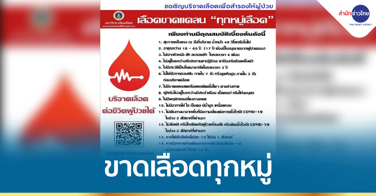 ทั้งนี้ ติดต่อบริจาคเลือดได้ทุกวันที่ ศูนย์รับบริจาคเลือดศิริราช อาคารนวมินทรบพิตร ๘๔ พรรษา ชั้น 3 รพ.ศิริราช เวลา 08.30-16.00 น. หรือสอบถามเพิ่มเติมได้ที่ โทร. 0 2414 0100, 0 2414 0102 ในวันและเวลาทำการ. -สำนักข่าวไทย