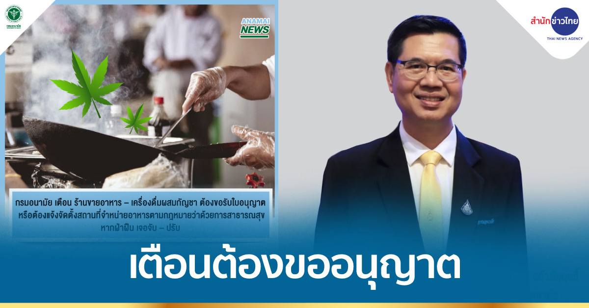 กรมอนามัย กระทรวงสาธารณสุข เตือน ร้านอาหารที่มีการทำ ปรุง หรือประกอบอาหาร และจำหน่ายอาหารหรือเครื่องดื่มที่ผสมกัญชา ก่อนที่จะนำอาหารไปจำหน่ายแบบออนไลน์ หรือจำหน่ายให้ผู้บริโภคผ่านช่องทางต่างๆ ต้องขอรับใบอนุญาตหรือขอรับหนังสือรับรองการแจ้งจัดตั้งสถานที่จำหน่ายอาหารจากเจ้าพนักงานท้องถิ่น ซึ่งเป็นที่ตั้งของสถานที่จำหน่ายอาหารหรือสถานที่ที่มีการทำ ปรุง หรือประกอบอาหารเพื่อจำหน่าย หากไม่ได้รับใบอนุญาตหรือไม่ได้แจ้ง ต้องระวางโทษปรับ หรือจำคุก