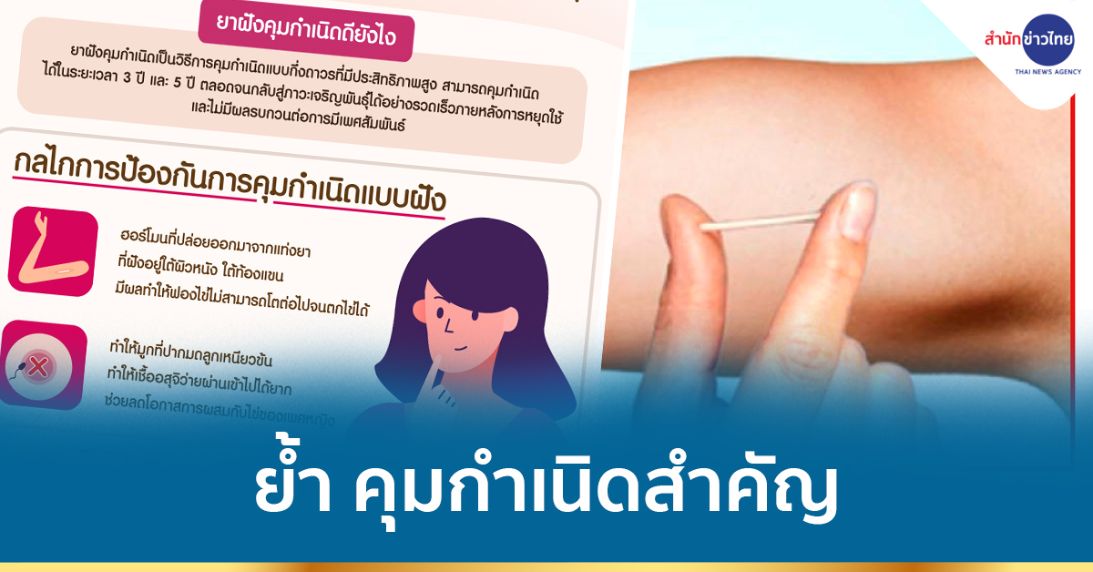 “ทั้งนี้ ยาฝังคุมกำเนิดเป็นวิธีการคุมกำเนิดแบบกึ่งถาวรที่มีประสิทธิภาพสูง สามารถคุมกำเนิด ได้ในระยะเวลา 3 ปี และ 5 ปี ตลอดจนกลับสู่ภาวะเจริญพันธุ์ได้อย่างรวดเร็วภายหลังการหยุดใช้ และไม่มีผลรบกวนต่อการมีเพศสัมพันธ์ โดยมีกลไกการป้องกันการคุมกำเนิด คือ ฮอร์โมนที่ปล่อยออกมาจาก แท่งยาฝังที่อยู่ใต้ผิวหนัง ใต้ท้องแขน มีผลทำให้ฟองไข่ไม่สามารถโตต่อไปจนตกไข่ได้ จึงไม่สามารถตั้งครรภ์ได้ นอกจากนี้ ฮอร์โมนยาฝังคุมกำเนิดนี้ยังทำให้มูกที่ปากมดลูกเหนียวข้น ทำให้เชื้ออสุจิว่ายผ่านเข้าไปได้ยาก ช่วยลดโอกาสการผสมไข่ สตรีที่ใช้ยาฝังคุมกำเนิดจะมีโอกาสตั้งครรภ์น้อยกว่า 1 ใน 2,000 จึงเป็นการช่วยลดการตั้งครรภ์ที่ไม่พร้อม หรือการตั้งครรภ์ซ้ำได้” อธิบดีกรมอนามัย กล่าว .-สำนักข่าวไทย