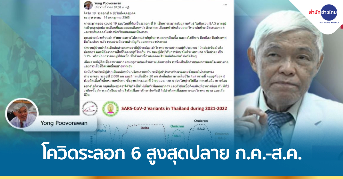ด้าน นพ.ยง ภู่วรวรรณ หัวหน้าศูนย์เชี่ยวชาญเฉพาะทางด้านไวรัสวิทยาคลินิก ภาควิชากุมารเวชศาสตร์ คณะแพทยศาสตร์ จุฬาลงกรณ์มหาวิทยาลัย โพสต์ข้อความผ่านเฟซบุ๊ก เตือนโควิด-19 ระลอก 6 จะมีจุดสูงสุดปลายเดือนนี้ และตลอดเดือนสิงหาคม ก่อนจะลดลงในช่วงนักเรียนสอบและปิดเทอม