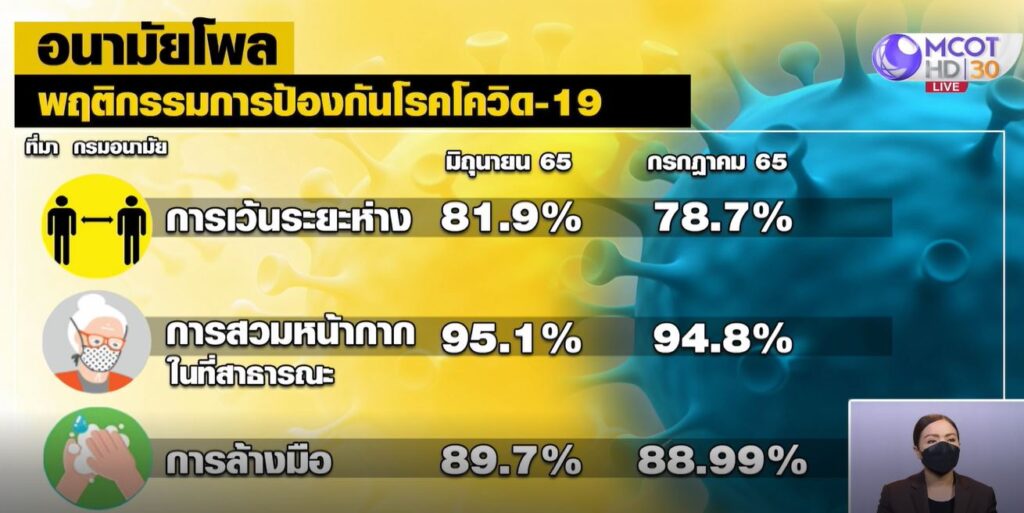นายธนกร วังบุญคงชนะ โฆษกประจำสำนักนายกรัฐมนตรี เปิดเผยข้อมูลการสำรวจอนามัยโพลของกรมอนามัย เปรียบเทียบระหว่างเดือนมิถุนายนและเดือนกรกฎาคม 2565 พบว่าประชาชนมีแนวโน้มพฤติกรรมการป้องกันโรคโควิด-19 ลดลง