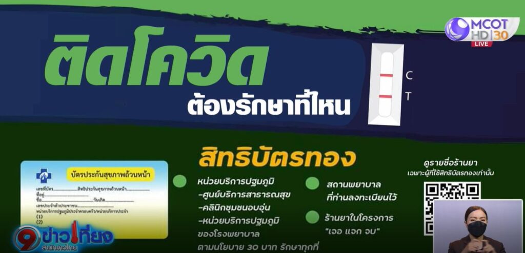 กรมการแพทย์แนะวิธีเข้ารับการรักษาโรคโควิด ในแต่ละสิทธิการรักษา หากใช้สิทธิบัตทอง สามารถเข้ารับการรักษาได้ที่หน่วยบริการปฐมภูมิ ได้แก่ ศูนย์บริการสาธารณสุข คลินิกชุมชนอบอุ่น หน่วยบริการปฐมภูมิของโรงพยาบาล สถานพยาบาลที่ลงทะเบียนไว้ และร้านขายยาในโครงการเจอ แจก จบ ตามนโยบาย 30 บาท รักษาทุกที่