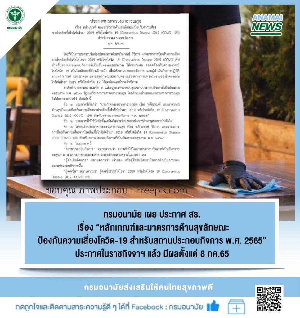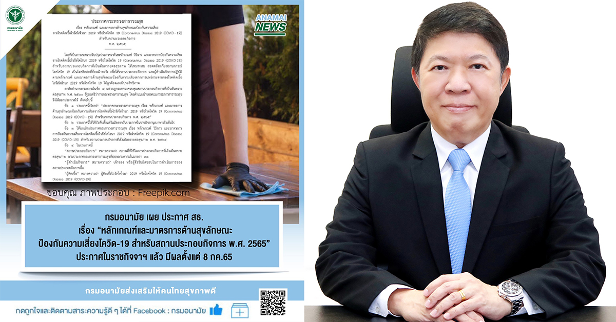 นายแพทย์สุวรรณชัย วัฒนายิ่งเจริญชัย อธิบดีกรมนามัย เปิดเผยว่า ขณะนี้ประกาศกระทรวงสาธารณสุข เรื่อง หลักเกณฑ์ และมาตรการด้านสุขลักษณะป้องกันความเสี่ยงจากโรคติดเชื้อไวรัสโคโรนา 2019 หรือโรคโควิด-19 สำหรับสถานประกอบกิจการ พ.ศ. 2565 ซึ่งลงนามโดยรัฐมนตรีช่วยว่าการกระทรวงสาธารณสุข (ดร.สาธิต ปิตุเตชะ) ได้ประกาศในราชกิจจานุเบกษา เมื่อวันที่ 7 กรกฎาคม 2565 ที่ผ่านมา โดยมีผลบังคับใช้ตั้งแต่ 8 กรกฎาคม 2565 เป็นต้นไป ซึ่งเนื้อหาในประกาศกำหนดให้ผู้ดำเนินกิจการต้องปฏิบัติตามหลักเกณฑ์ และมาตรการด้านสุขลักษณะป้องกันควสามเสี่ยงโควิด-19 ดังนี้
