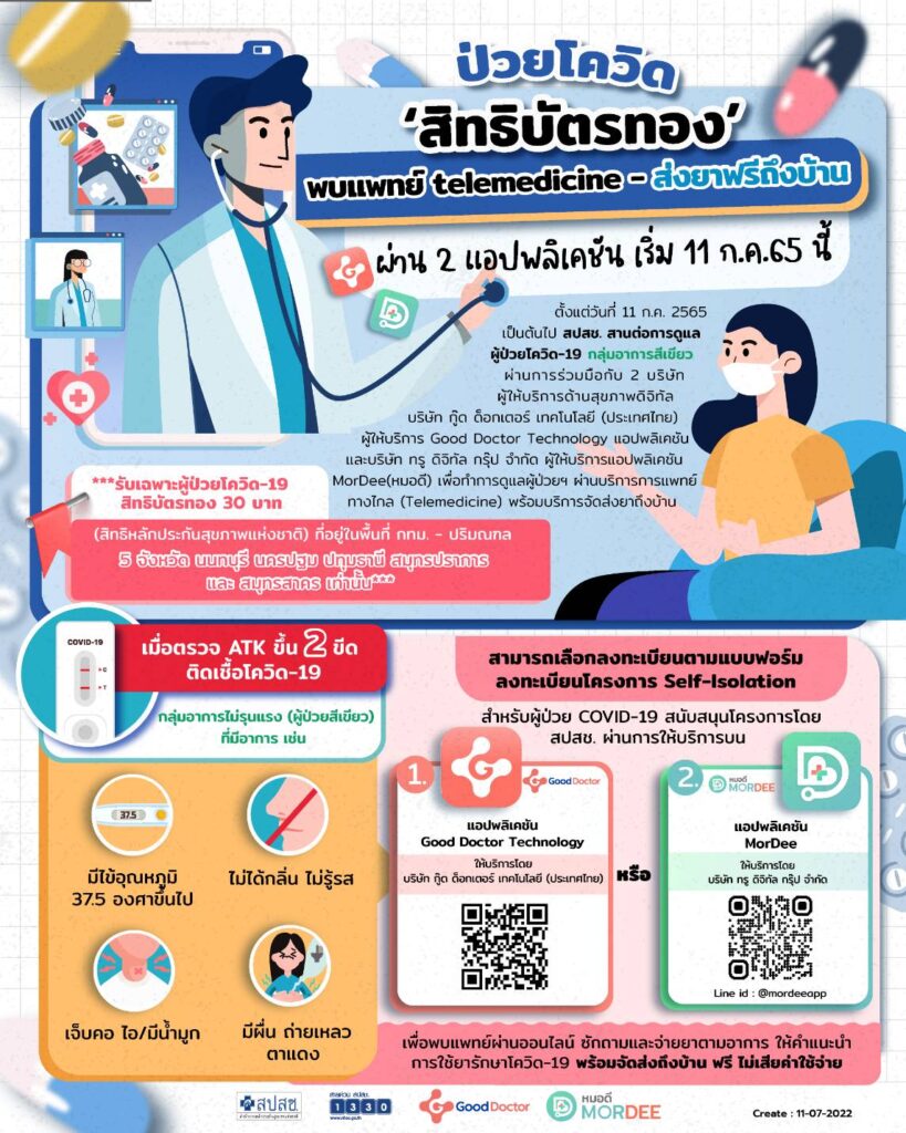 ทั้งนี้ เมื่อผู้ใช้สิทธิบัตรทองรายใดที่ตรวจ ATK ขึ้น 2 ขีด และไม่อยู่ในกลุ่มเสี่ยงข้างต้น สามารถลงทะเบียนตามแบบฟอร์มลงทะเบียนโครงการ Self-Isolation สำหรับผู้ป่วยโควิด-19 ผ่านแอปฯ กู๊ด ดอกเตอร์ หรือ แอปฯ MorDee (หมอดี) จากนั้นจะมีการตรวจสอบสิทธิบัตรทอง โดยเจ้าหน้าที่ติดต่อกลับไปยังผู้ป่วยเพื่อยืนยันตัวตนเข้ารับบริการแล้วเข้าสู่ระบบพูดคุยกับแพทย์ผ่านระบบออนไลน์เพื่อประเมินอาการและจัดส่งยาตามความจำเป็นให้กับผู้ป่วย โดยบางรายอาจได้รับยาฟาวิพิราเวียร์ที่ขึ้นอยู่กับอาการ