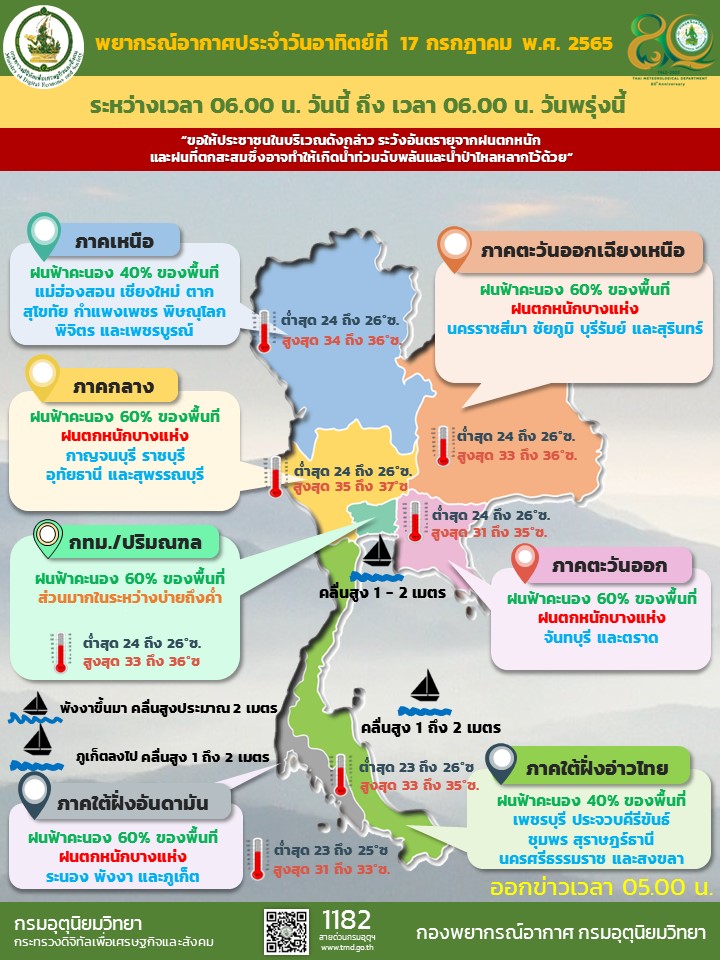 กรมอุตุนิยมวิทยา เผยมรสุมตะวันตกเฉียงใต้กำลังปานกลางพัดปกคลุมทะเลอันดามัน ประเทศไทย และอ่าวไทย ประกอบกับลมใต้พัดปกคลุมภาคเหนือและภาคตะวันออกเฉียงเหนือ ลักษณะเช่นนี้ทำให้ประเทศไทยยังคงมีฝนฟ้าคะนองกับมีฝนตกหนักบางแห่งบริเวณภาคตะวันออกเฉียงเหนือ ภาคกลาง ภาคตะวันออก และภาคใต้ฝั่งตะวันตก ขอให้ประชาชนในบริเวณดังกล่าวระวังอันตรายจากฝนตกหนักและฝนที่ตกสะสม ซึ่งอาจทำให้เกิดน้ำท่วมฉับพลันและน้ำป่าไหลหลากไว้ด้วย สำหรับคลื่นลมบริเวณทะเลอันดามันมีกำลังปานกลาง โดยทะเลอันดามันตอนบนมีคลื่นสูงประมาณ 2 เมตร บริเวณที่มีฝนฟ้าคะนองคลื่นสูงมากกว่า 2 เมตร ส่วนอ่าวไทยทะเลมีคลื่นสูง 1-2 เมตร ห่างฝั่งคลื่นสูงประมาณ 2 เมตร ขอให้ชาวเรือเดินเรือด้วยความระมัดระวังและหลีกเลี่ยงการเดินเรือบริเวณที่มีฝนฟ้าคะนอง