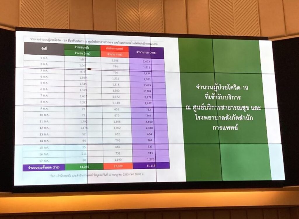 ขณะที่ พญ.วันทนีย์ วัฒนะ รองปลัดกรุงเทพมหานคร เปิดเผยข้อมูลผู้ติดเชื้อโควิด-19 ใน กทม.ขณะนี้ เฉลี่ย 2,000-3,000 คน/วัน ส่วนใหญ่เป็นผู้ป่วยสีเขียว แพทย์ให้ยาตามเกณฑ์ที่กรมการแพทย์กำหนด กทม.ยังมีเตียงเพียงพอ โดยข้อมูลวันที่ 1-17 ก.ค. 65 มีรายงานผู้ป่วยโควิด-19 ที่เข้ามารับบริการที่ที่ศูนย์บริการสาธารณสุขและโรงพยาบาลสังกัดสำนักการแพทย์ กทม. รวม 31,119 ราย